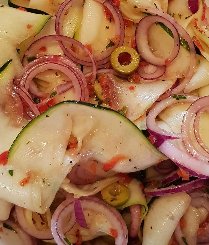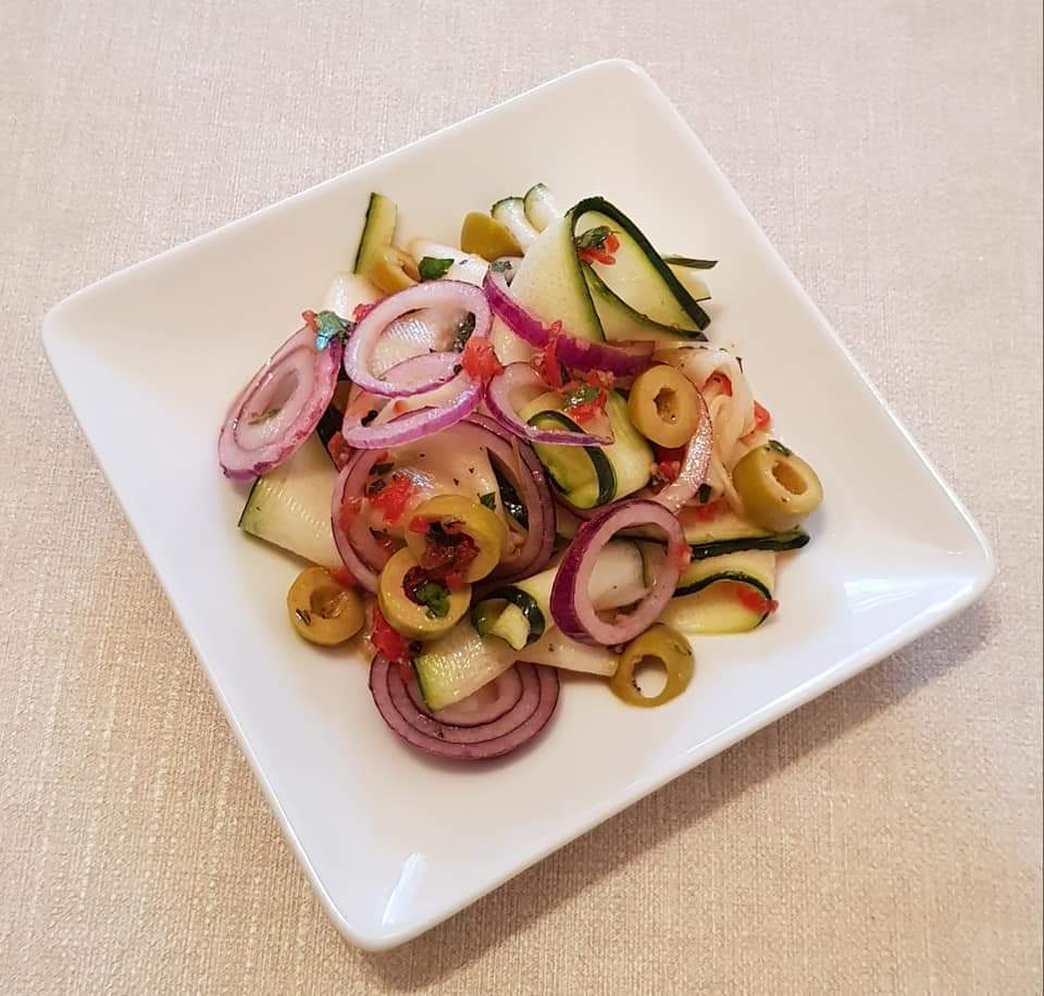 Se amesteca într-un bol fâșiile de zucchini, maslinele si ceapa rosie. Intr-un bol mai mic se prepară dressingul amestecandu-se ardeiul ras, sucul de lime, coaja de lămâie, busuiocul, cimbrul, sarea, piperul si uleiul de măsline extra virgin. Se toarnă amestecul peste salată si se amestecă pentru omogenizare. 😋