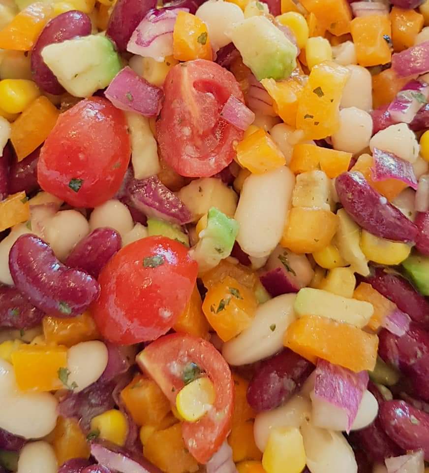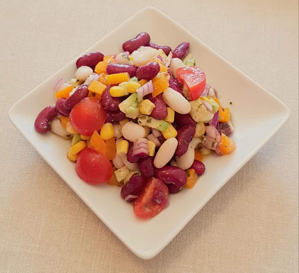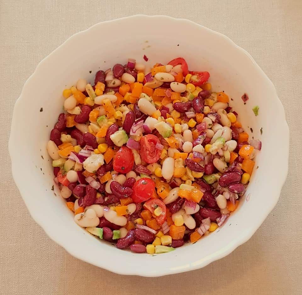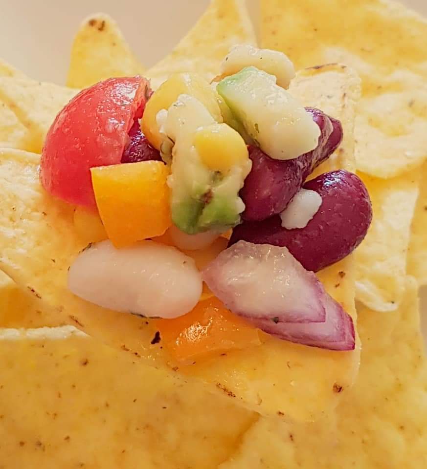 Într-un bol se amestecă ingredientele pentru dressing. Intr-ul bol se combină ingredientele pentru salată. Ceapă se taie cât mai mărunt. Avocado se taie cubulețe. Ardeiul galben se taie cubulețe. Se adaugă cele 2 tipuri de fasole si porumbul. Se amestecă ingredientele cu dressingul. Se servesc cu tortilla chips.