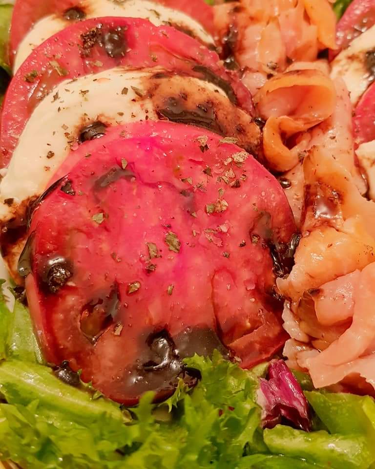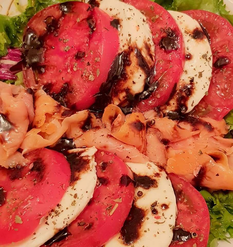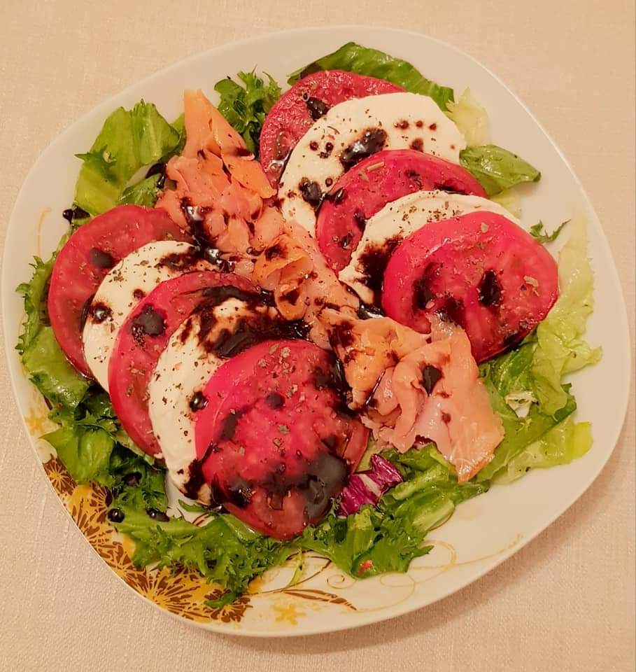 Salată Caprese cu somon afumat