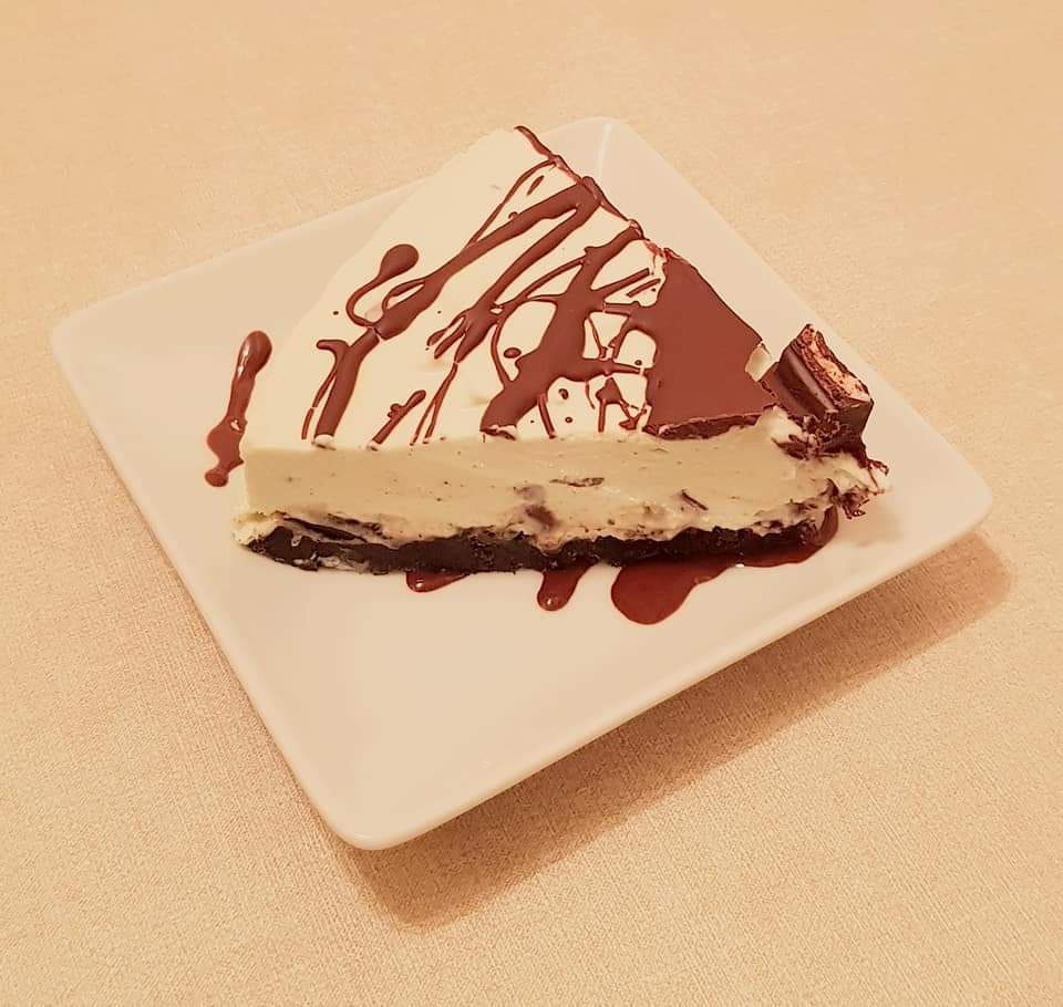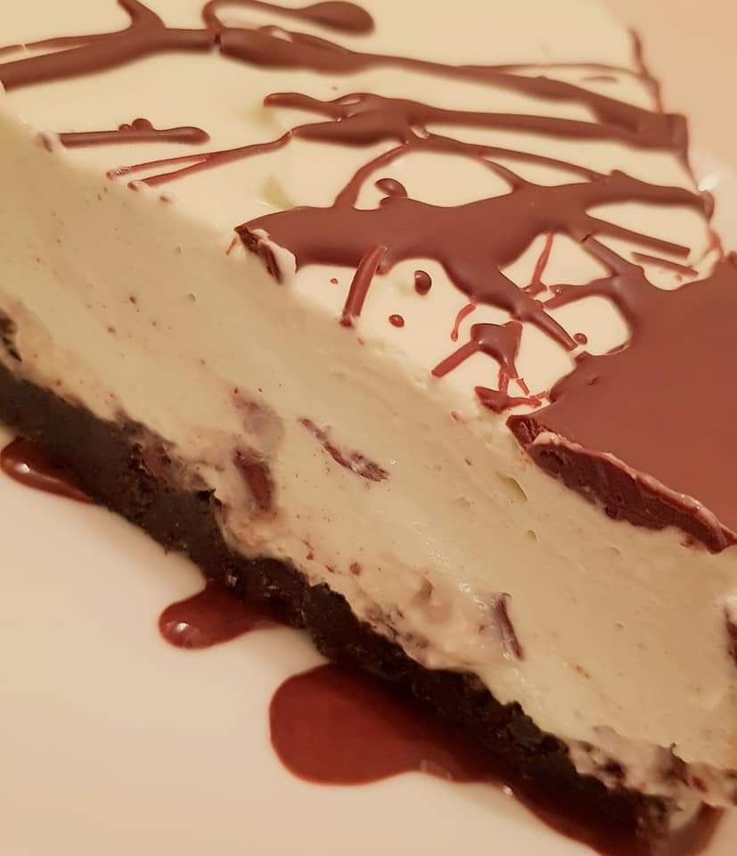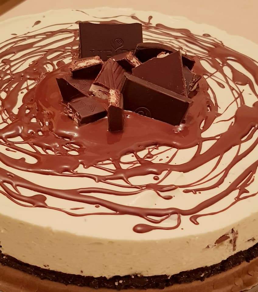 Se prepară blatul de biscuiți. Se zdrobesc biscuiții Oreo și se adaugă untul topit. Apoi se așează compoziția de biscuiți într-o tavă tapetata cu hârtie de copt si se pune până la prepararea cremei în congelator. Se mixeaza frișcă lichidă. Apoi se adaugă cremă de brânză și mascarpone. Se amestecă pentru omogenizare. Se adaugă zahărul pudră și colorantul alimentar cate putin până se ajunge la culoarea dorită. Se adaugă esențele de vanilie si mentă. Se amestecă pentru omogenizare, apoi se adaugă gelatina hidratata si încălzită. Se amestecă și se adaugă ciocolata zdrobită. Apoi se pune compoziția peste blatul de biscuiți și se lasa la frigider timp de 6 ore. Pentru decor am folosit ciocolată topită și câteva bucăți de ciocolată cu mentă 🙂