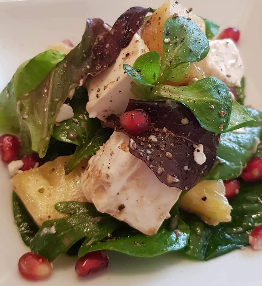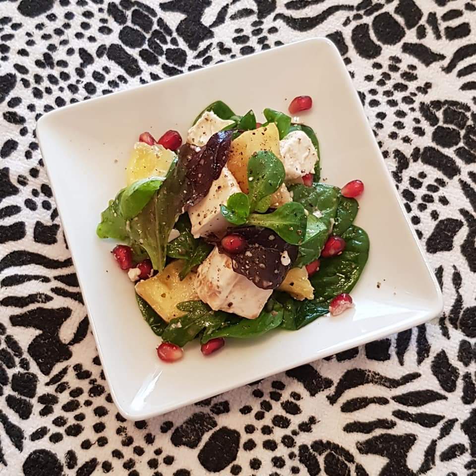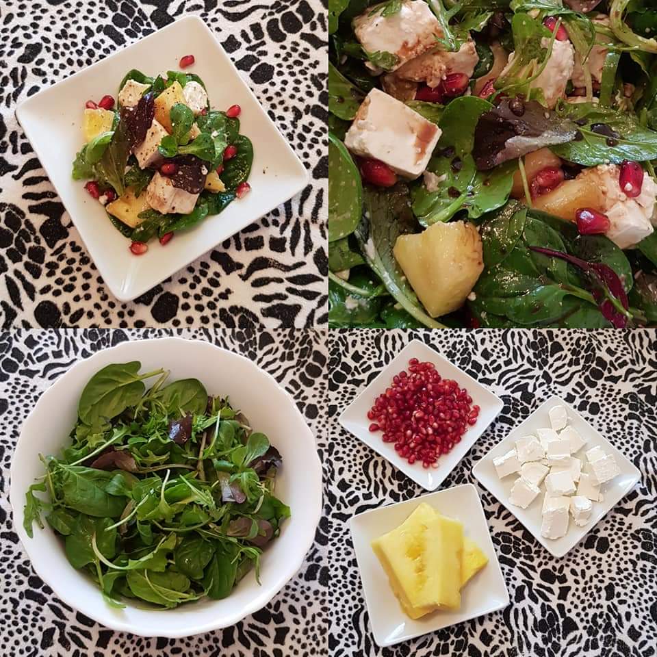 Într-un bol se adaugă mixul de salată. Feta se taie cubulețe. Rodia se curăță. Ananasul se curăță și se taie cubulețe. Peste salată se adaugă restul ingredientele. Se asezonează cu ulei de măsline extra virgin, oțet balsamic, sare și piper.