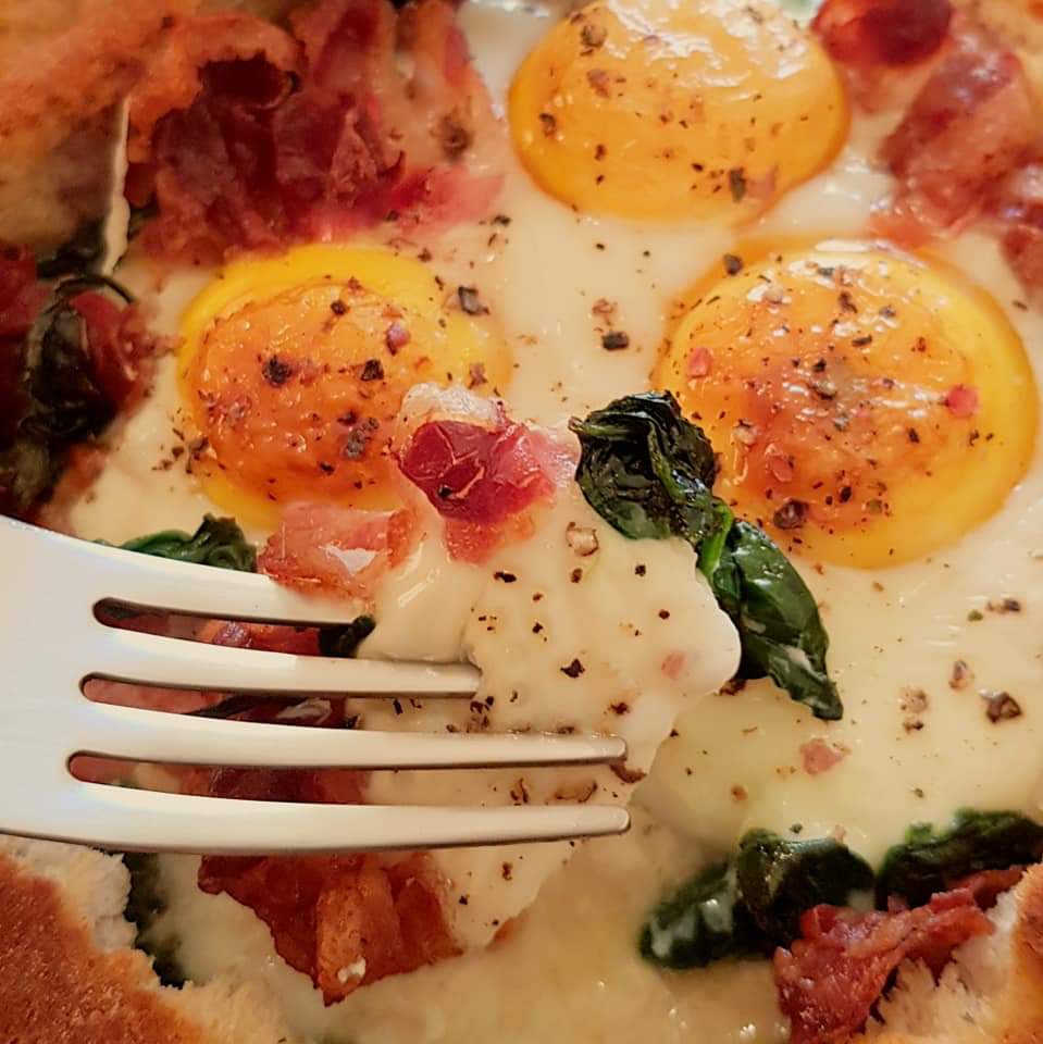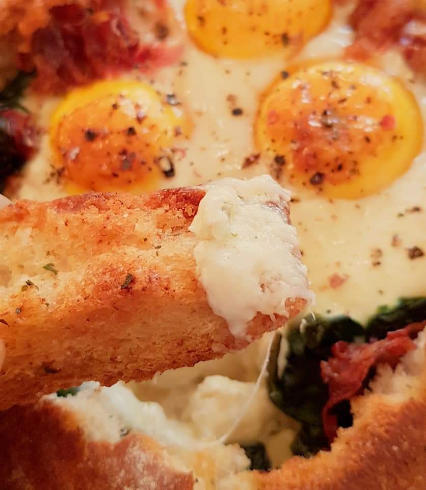 Pâine umplută cu cremă de brânză, baby spanac, bacon, parmezan și ouă, unsă cu mult unt topit și rumenită în cuptor… Un mic dejun de weekend delicios 😋