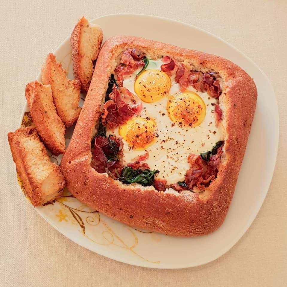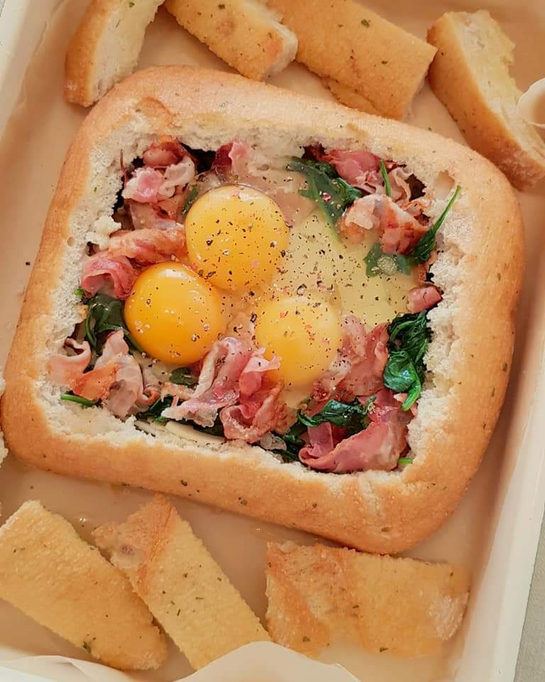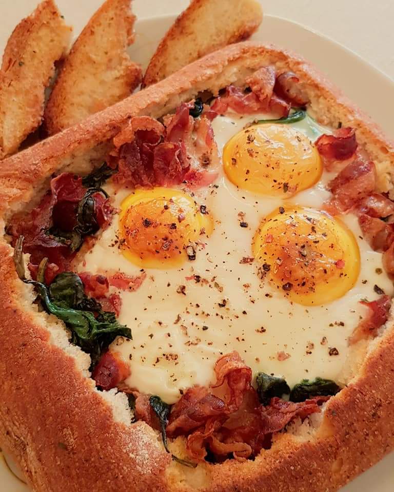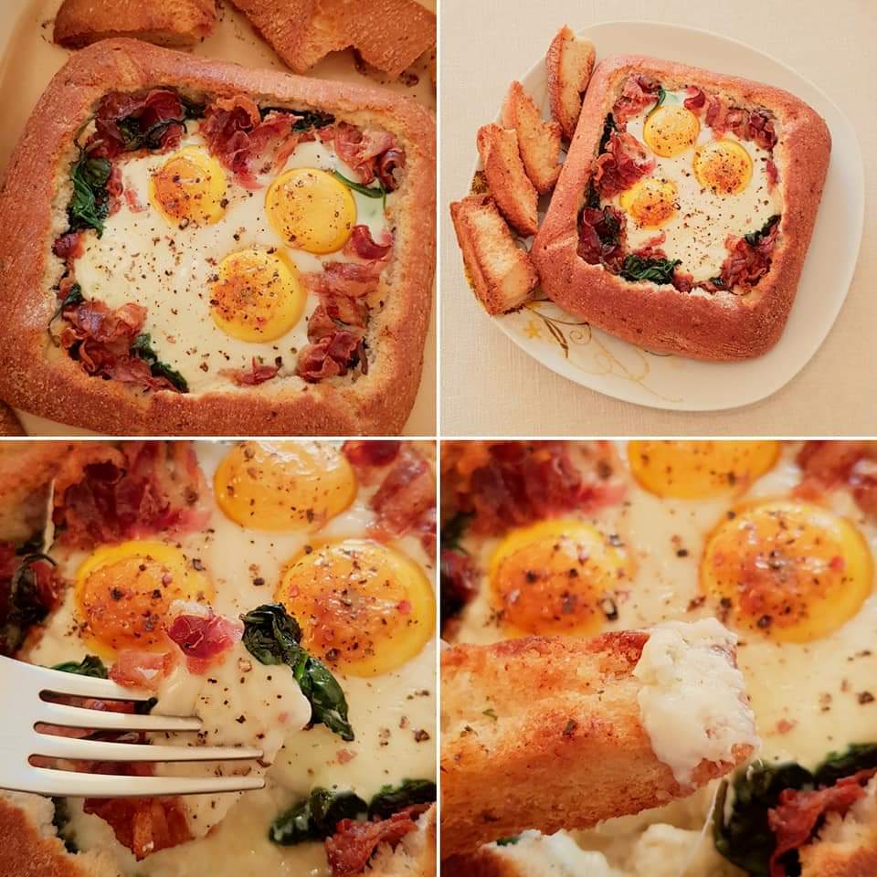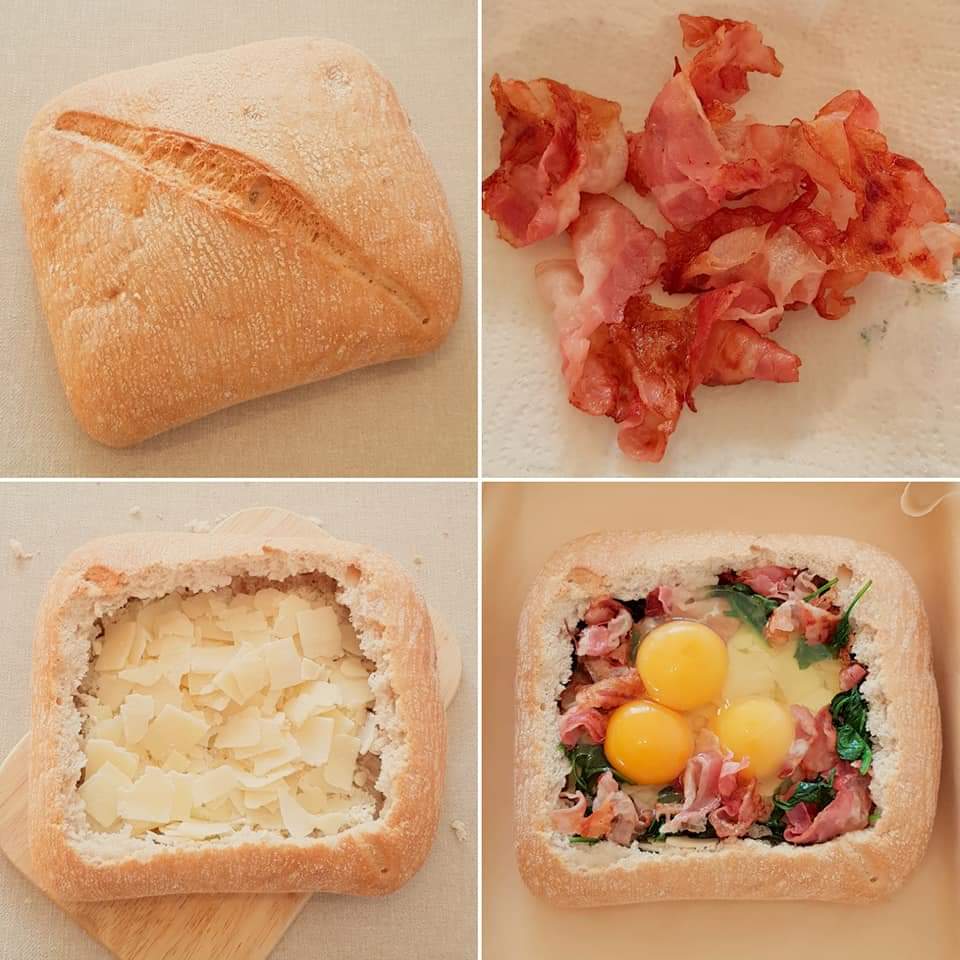 Se taie un capac la pâine și se scoate mierzul pâinii afară (vezi poze). Capacul pâinii se taie felii. Baconul se prăjeste într-o tigaie, apoi se scoate pe un șervețel absorbant. În grăsimea scursă de la bacon se pune baby spanacul pentru 2-3 minute. Pâinea se umple unge în interior cu cremă de brânză. Se adaugă parmezanul. Apoi baby spanacul. Baconul prăjit și se sparge cu grija ouăle. Se condimentează cu sare și piper. Capacul pâinii tăiat bucățele și miezul se unge cu unt topit amestecat cu pătrunjel. La fel și marginile pâinii. Se pune pâinea umplută și bucățele de pâine pe o tavă tapetata cu hârtie de copt și se pune în cuptorul preincalzit la 200° pentru aproximativ 10 minute sau până sunt gata ouăle.
