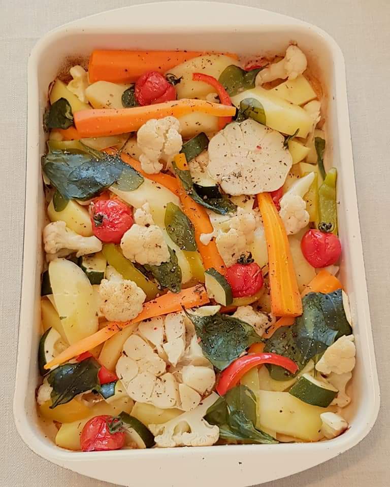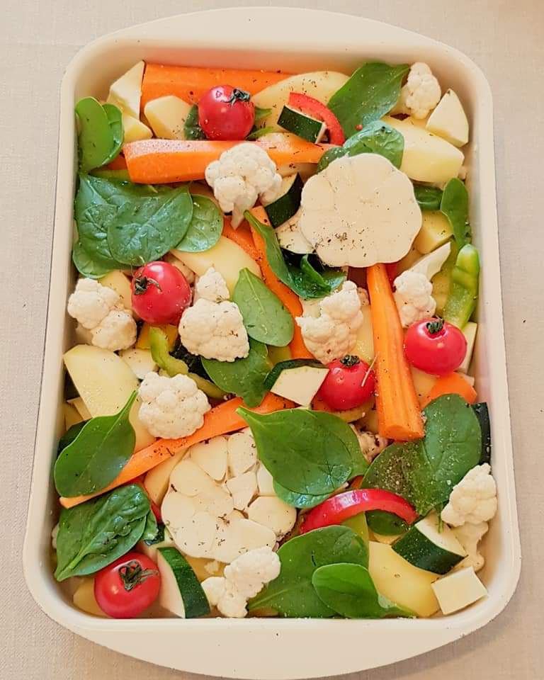 Cartofi se curăță, se spală și se taie în sferturi. Morcovii se curăță, se spală și se taie în sferturi sau rondele. Zucchini se spală și se taie în funcție de preferințe. Conopida se spală și se rupe buchețele. Căpățâna de usturoi se spală și se taie în jumătate. Roșiile cherry se spală și se lasă întregi. Baby spanacul se spală și se pune la scurs, iar ardeii se spală și se taie fâșii. Într-o tavă se adaugă uleiul și legumele. Se sărează și se piperează în funcție de preferințe. Se adaugă cimbru uscat și apa. Se acoperă tava cu folie de aluminiu și se pune în cuptorul preincalzit la 180° pentru 30-40 minute.