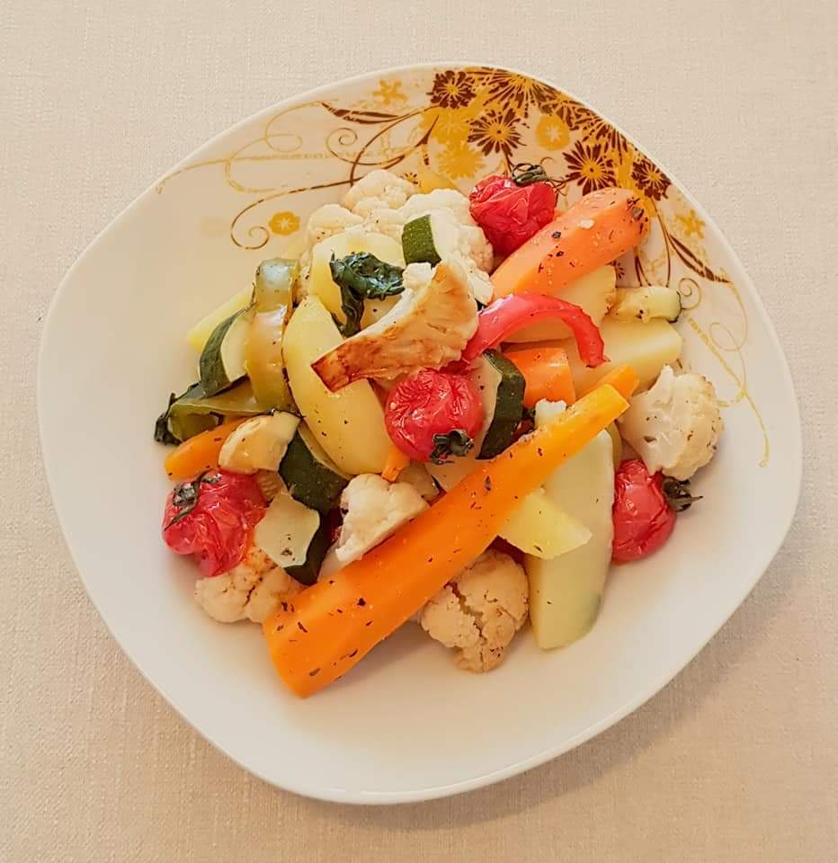 Legumele și fructele colorate sunt o adevărată sursă de sănătate. Nutriționiștii vorbesc despre un curcubeu al nutriției format din fructele si legumele de culoare roșie, portocalie, galbenă, verde, albă și mov. Azi vă propun o delicioasă farfurie cu legume la cuptor, în care puteți 5 culori: roșu, portocaliu, galben, verde și alb 🙂