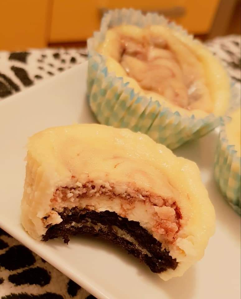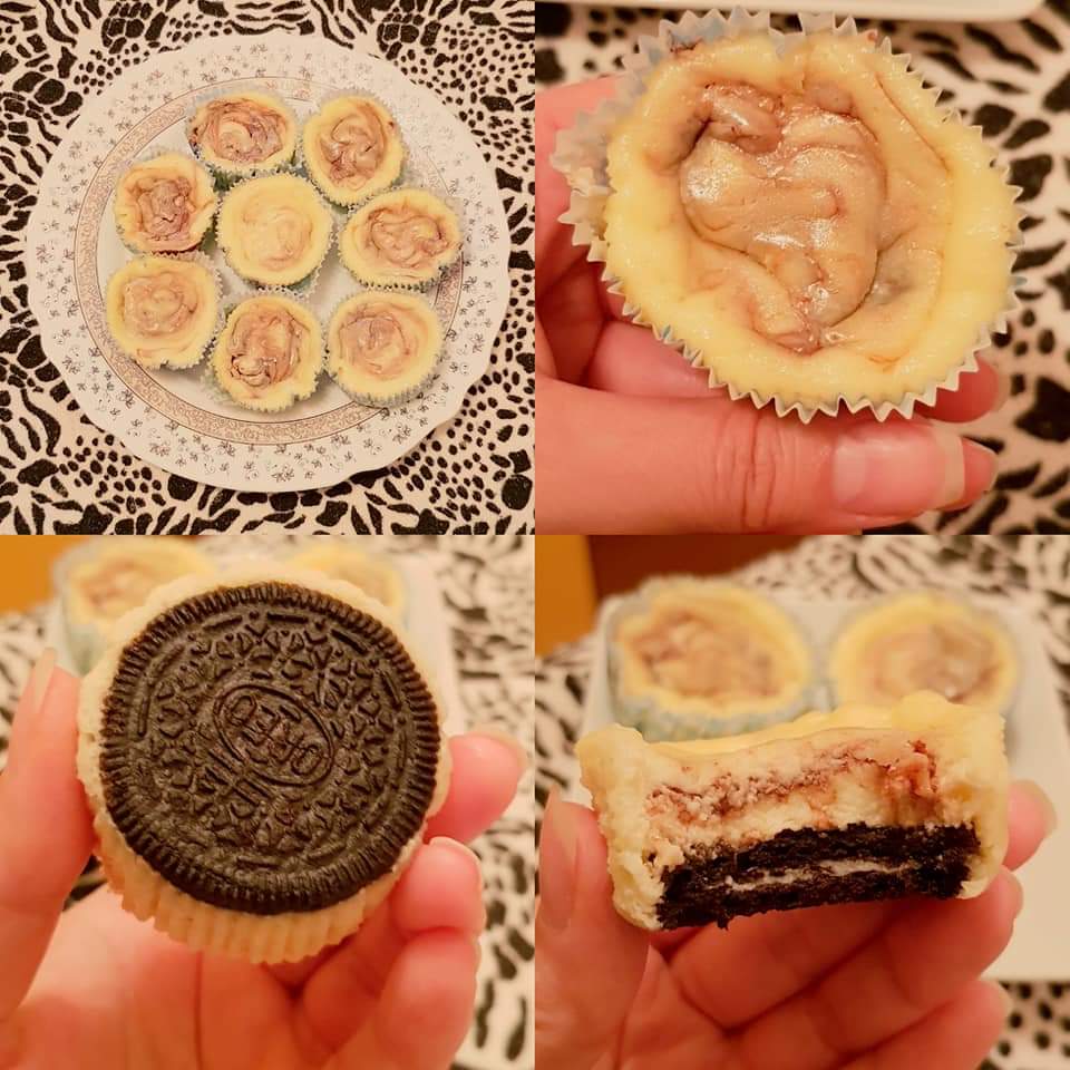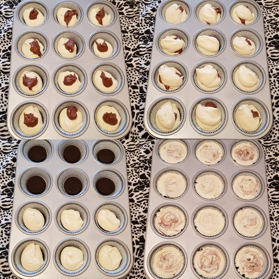 Intr-o tava pt briose se pun hârtiile pentru briose si în fiecare cate un biscuite Oreo. Mie mi-au iesit 23 de brioșe din ingredientele de mai sus. Deci aveți nevoie de vreo 23 de biscuiți… Într-un vas pt mixer se adaugă crema de brânză și zahărul și se mixeaza. Apoi se adaugă ouăle, smantana și esența de vanilie si se omogenizează. Se pune câte puțin din compoziție peste fiecare biscuite (dacă aveți puteți folosi o lingura pentru înghețată). Apoi peste o linguriță de cremă de ciocolată și apoi încă o lingură de compoziție. Apoi se omogenizează cu o scobitoare. Se pun în cuptorul preîncălzit la 150° pentru 22-25 de minute.