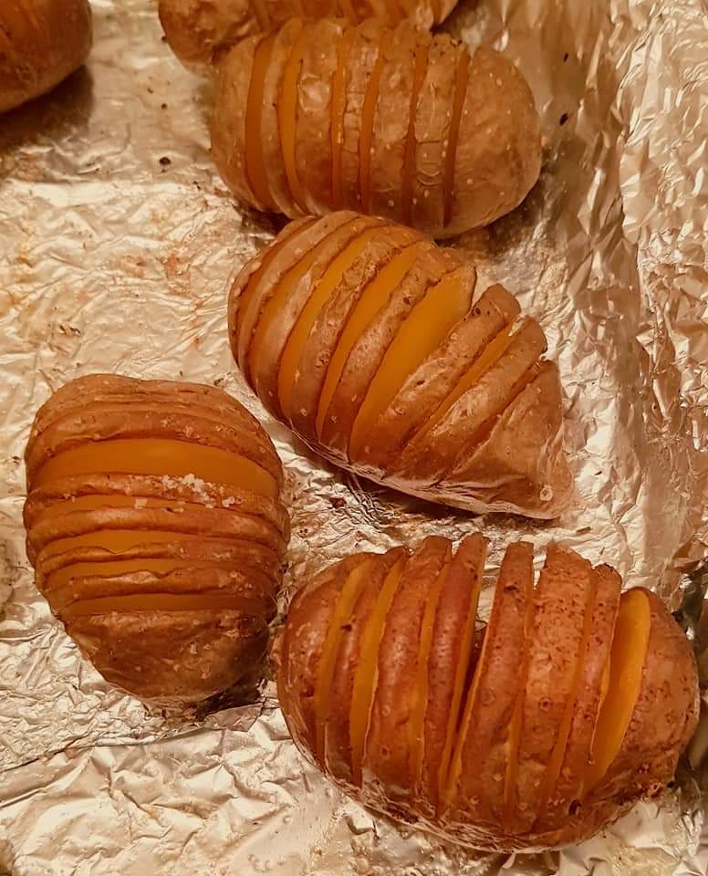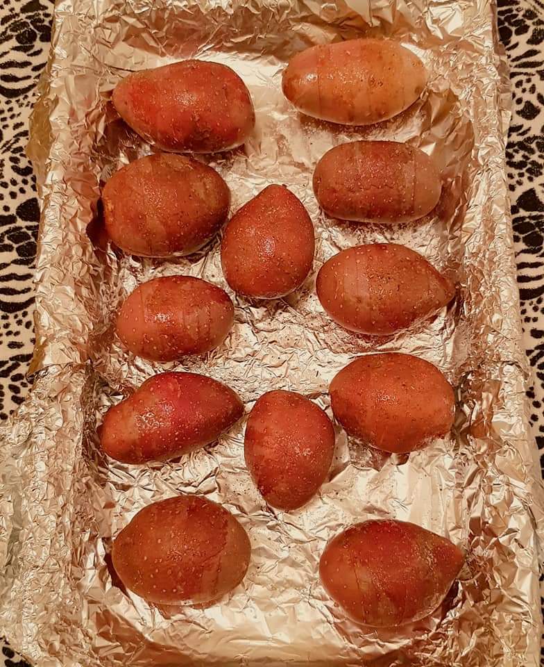 Cartofii se spală foarte bine cu ajutorul unui burete abraziv nou de bucătărie. Se pun într-o tavă tapetată cu folie de aluminiu sau hârtie de copt. Se pot lăsa întregi sau se pot tăia în formă de acordeon. Cu ajutorul unei pensule de bucătărie se ung cu ulei de măsline. Se condimentează cu sare și piper. Se pune tava în cuptorul preincalzit la 220° pentru 45 de minute. Se servesc calzi simpli cu puțină sare sau cu diferite topinguri în funcție de preferințe. Sunt delicioși în combinație cu felii subțiri de ceapă roșie, cubulețe de slăninuță sau bacon, cubulețe de unt, smântână sau chiar iaurt. Se pot servi cu coajă sau li se poate înlătura coaja. Oricum sunt delicioși 😋