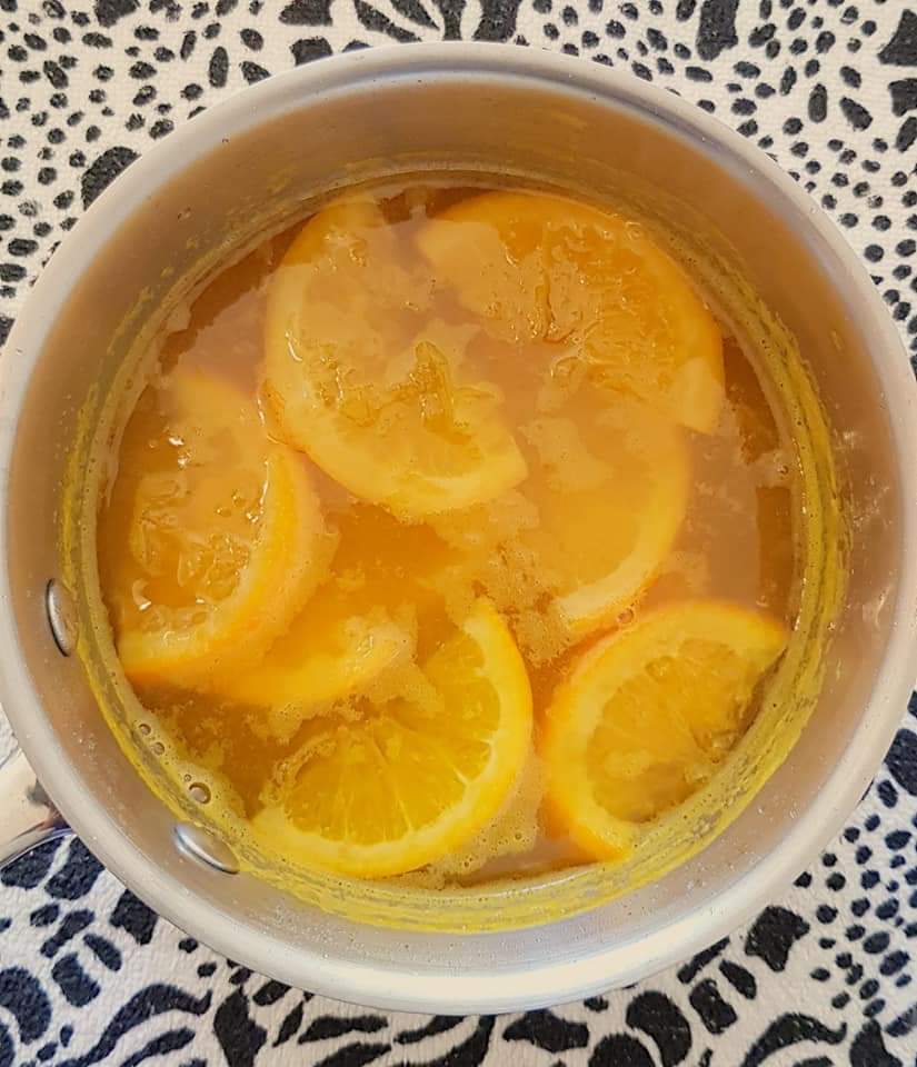 Se prepară siropul. Apa și zahărul se pun la fiert împreună cu batonul de scorțișoară. Se lasă 10 minute după ce începe să fiarbă apoi se adaugă sucul de portocale și feliile și se mai lasă la fiert 5minute. Apoi se pune la răcit.