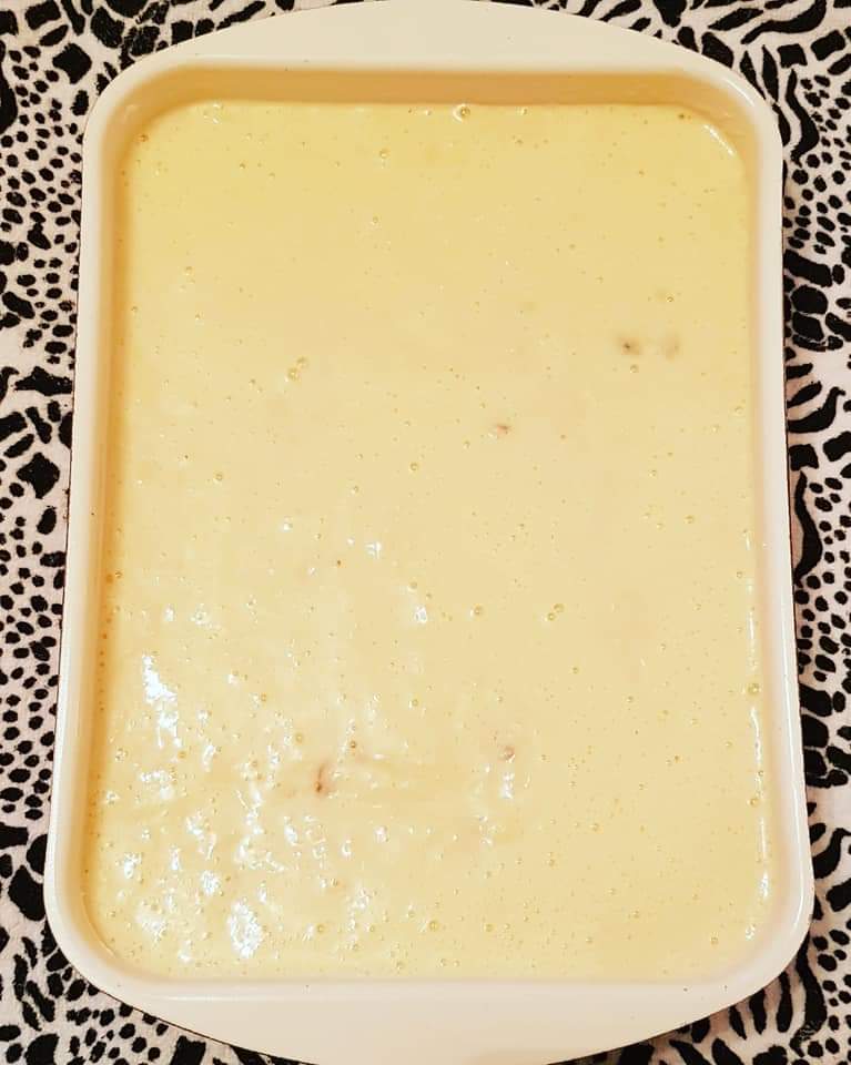 Se prepară aluatul. Iaurtul se pune intr-un vas mai mare și se amestecă cu cele 2 prafuri de copt si se lasă să se activeze. Ouăle se bat cu zahărul și esența de vanilie foarte bine până își schimbă culoarea și consistență, apoi se adaugă treptat uleiul și apoi sucul de portocale. La sfârșit se adaugă amestecul de iaurt și praf de copt. Apoi stafidele (pe care eu le-am hidratat în prealabil). Apoi se adauga foile de plăcintă rupte și se amestecă foarte bine cu o spatula. Aluatul obținut se pune într-o tavă unsa cu unt și se pune la copt în cuptorul preincalzit la 180° timp de 45 minute.