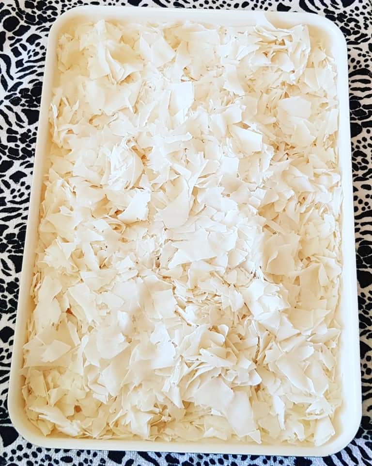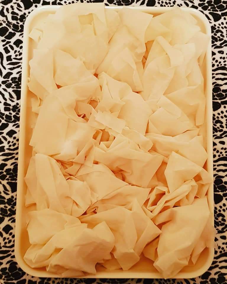 Foile de plăcintă se desfac una cate una și se așează într-o tavă și se lasă peste noapte la uscat.