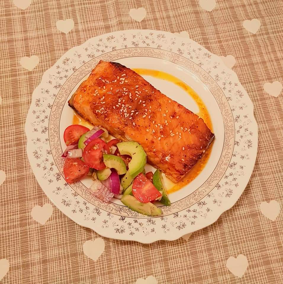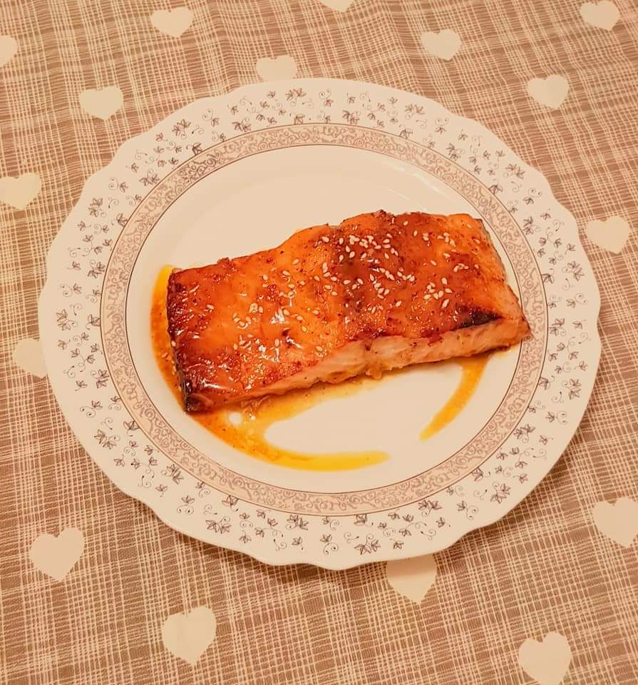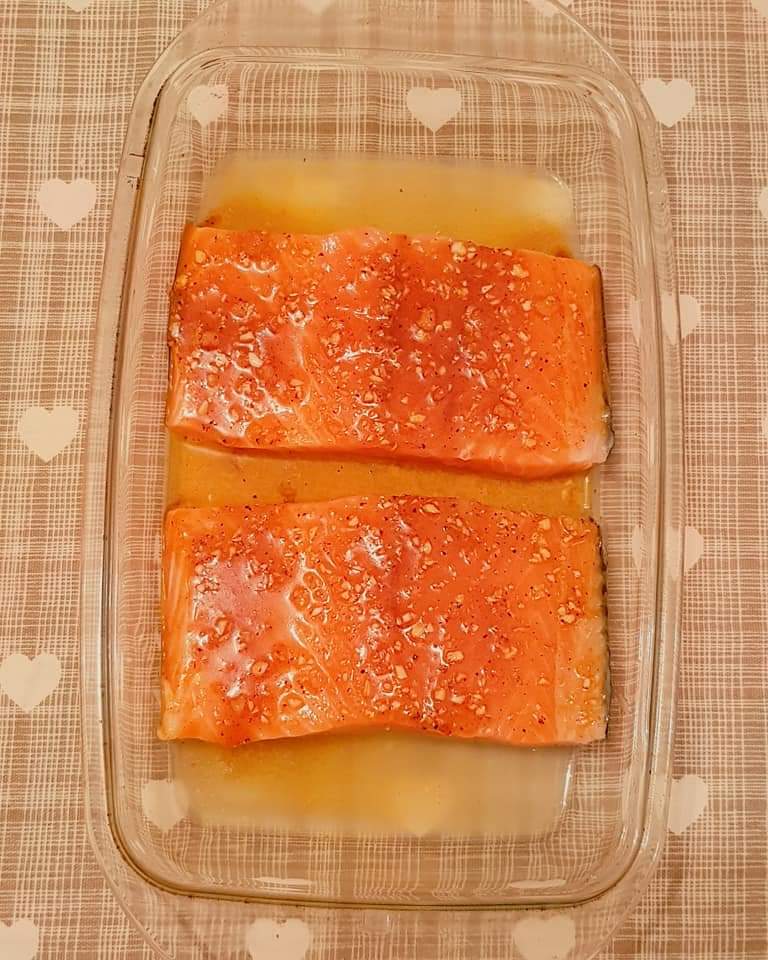 Somonul se tamponează cu un șervețel absorbant. Se sărează și se piperează. Se unge o tavă cu ulei de măsline. Se adaugă bucățile de somon. Intr-un bol se amestecă sucul de lămâie, sucul de portocale, sosul de soia, usturoiul și mierea. Se adaugă sosul obținut peste somon. Se pune tava în cuptorul preincalzit la 200° pentru 15-20 de minute.