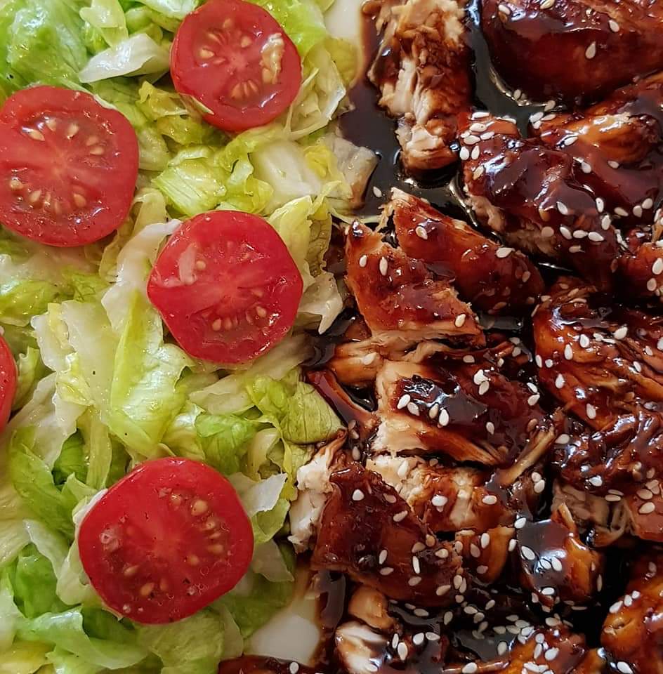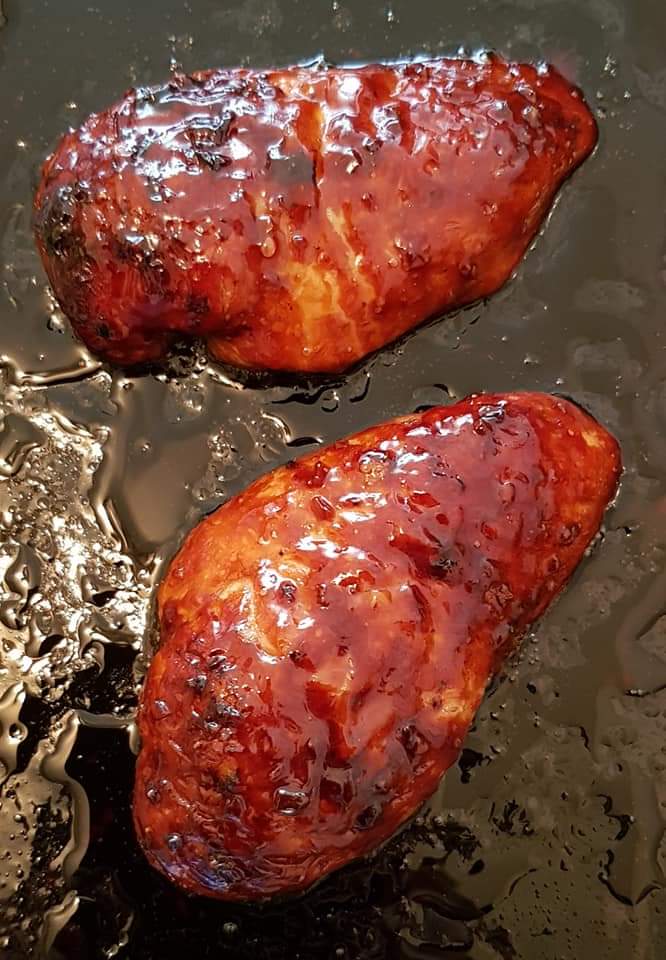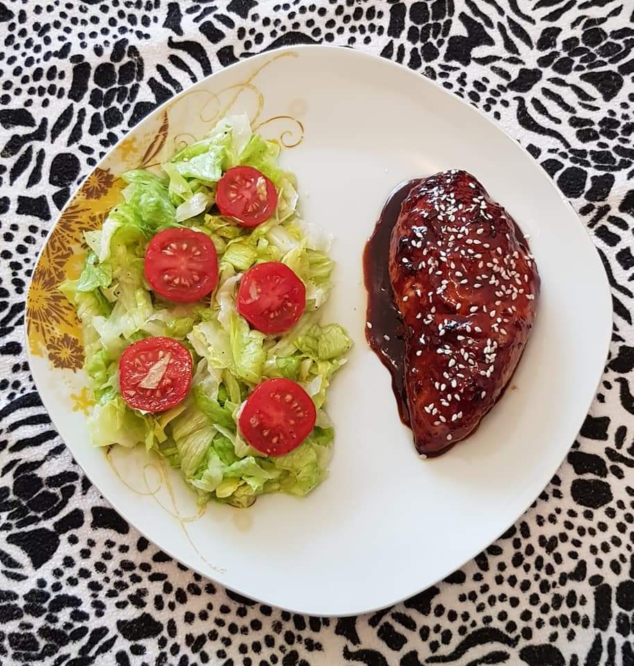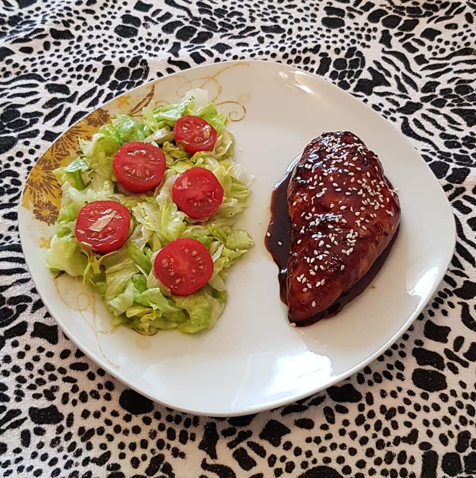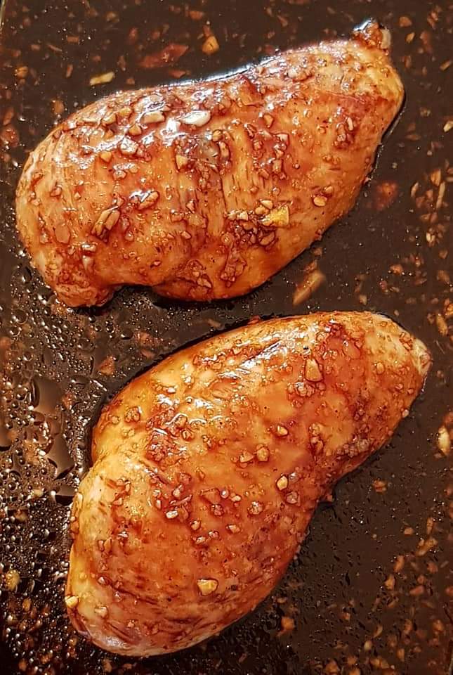 Apoi se pune într-o tavă și se prepară sosul combinându-se sosul de soia, usturoiul pisat, o lingură ulei de măsline extra virgin, sucul de lămâie, mierea și amidonul. Apoi se toarnă peste pieptul de pui și se pune tavă în cuptorul preincalzit la 180° pentru 25 minute.