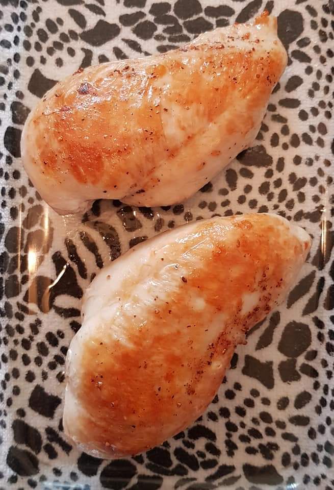 Pieptul de pui se taie în două, se sărează și se pipereaza și se prajeste într-o tigaie cu o lingură de ulei de măsline cate 4 minute pe fiecare parte.