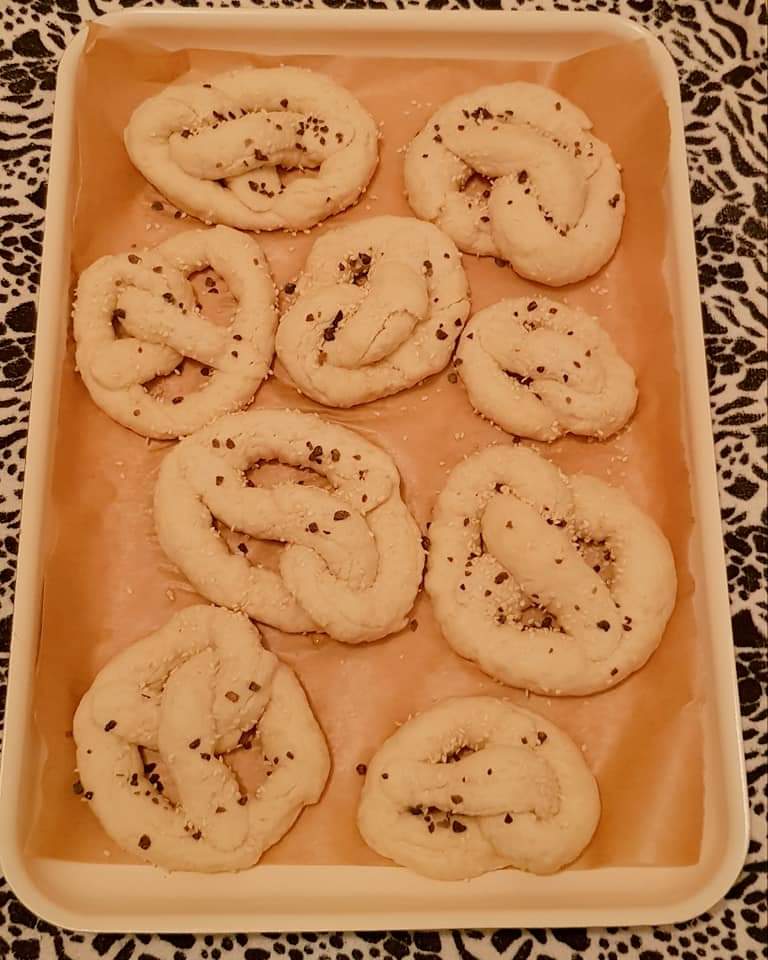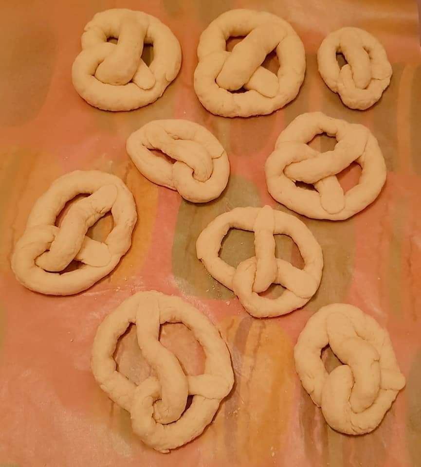 Se pune făina într-un bol. Drojdia se amestecă cu zahărul și se adaugă apă călduță peste ea. Se amestecă până la dizolvare și se pune peste faină. Începeți să frământati aluatul și adăugați treptat uleiul și sarea. Apoi presărati puțin ulei pe suprafață de lucru și frământati aluatul până devine elastic. Apoi îl lăsați 30 de minute la dospit. Apoi împărțiți aluatul în 10 parti aproximativ egale și rulați fiecare parte până obțineți un snur lung și subțire… Faceti un rulou și răsuciti la capete. Apoi întoarceți capetele și le presati ușor ca să nu se desfacă.