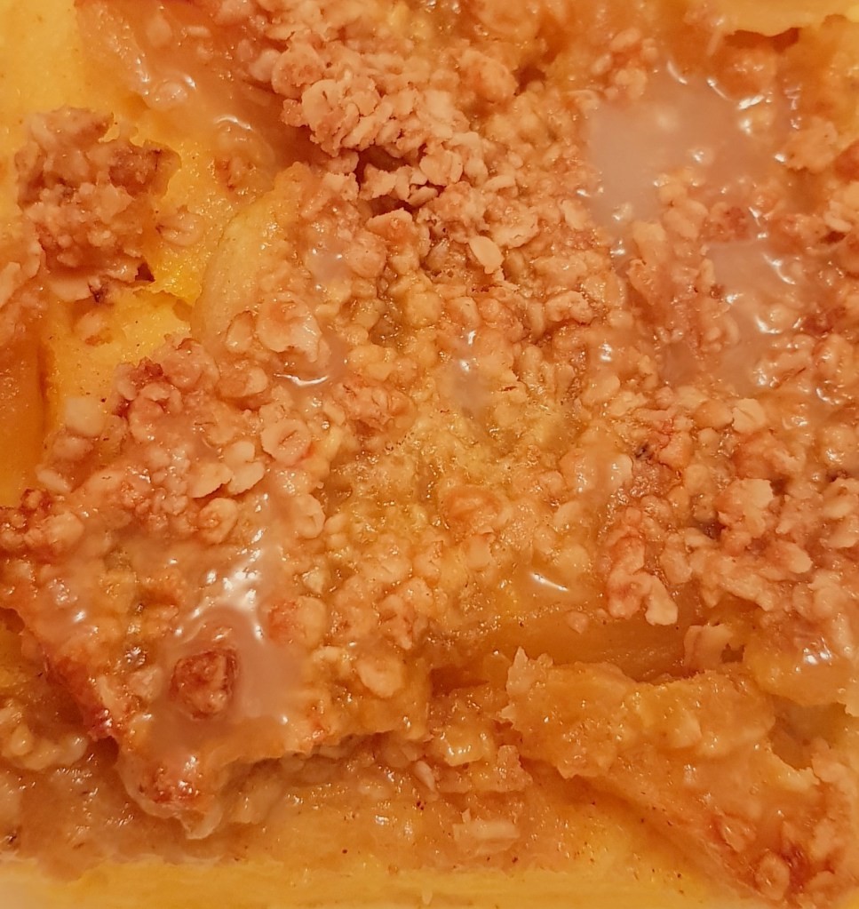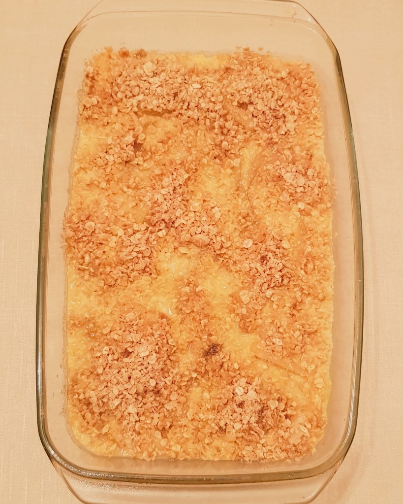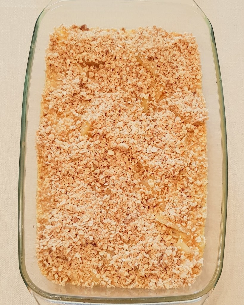 Apoi se prepară aluatul crocant prin amestecarea tuturor ingredientelor. Se împrăștie aluatul crocant peste umplutura de mere.