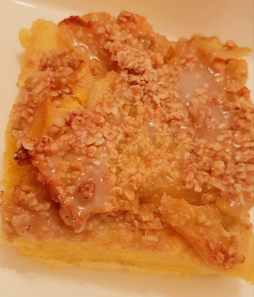 Se preîncălzește cuptorul la 175° și se pune vasul în cuptor pentru 45-50 minute până când budinca de pâine e gătită iar aluatul crocant se rumenește frumos. Se scoate din cuptor și se lasă câteva minute la răcorit. Opțional se prepară glazura prin amestecul celor 3 ingrediente și se împrăștie peste budincă 😋