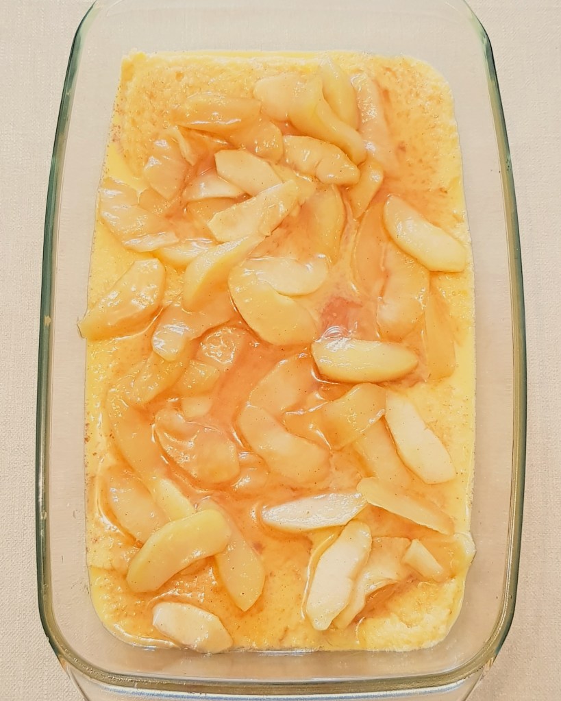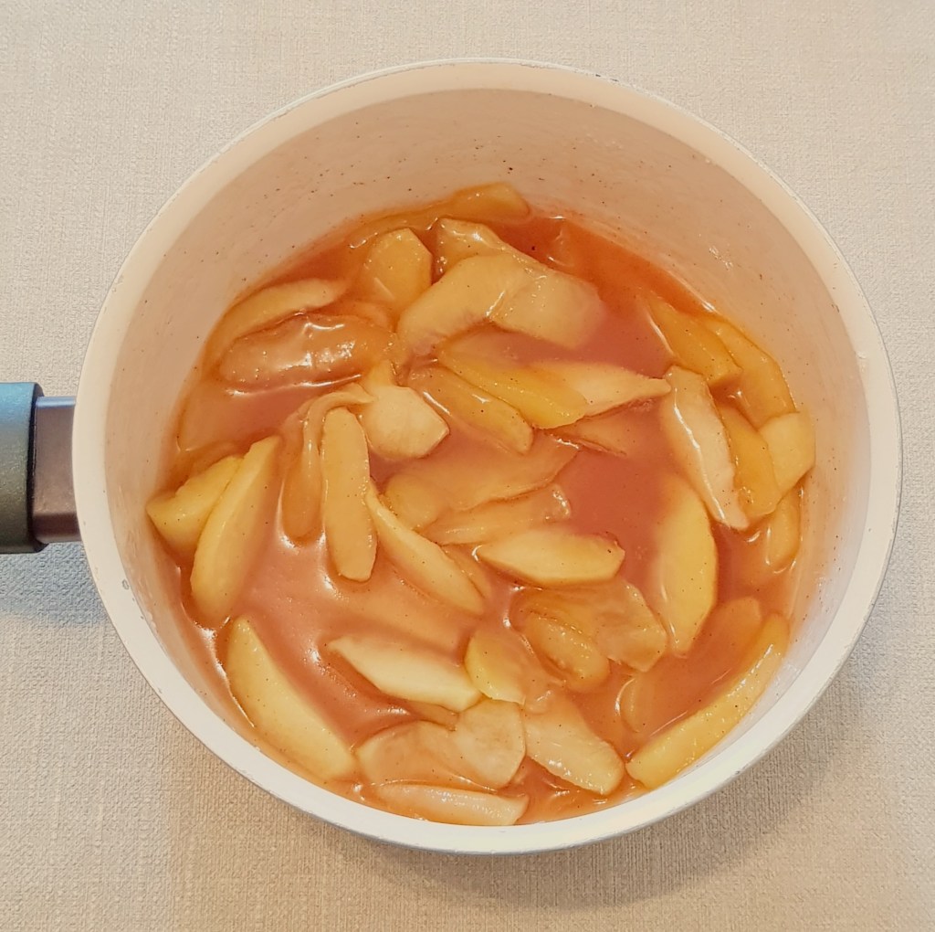 Merele se curăță de coajă și semințe, se taie felii și se pun într-o cratiță mai mică cu o lingură de unt topit, scorțișoara și zahărul pentru 10-15 minute până când merele devin moi.