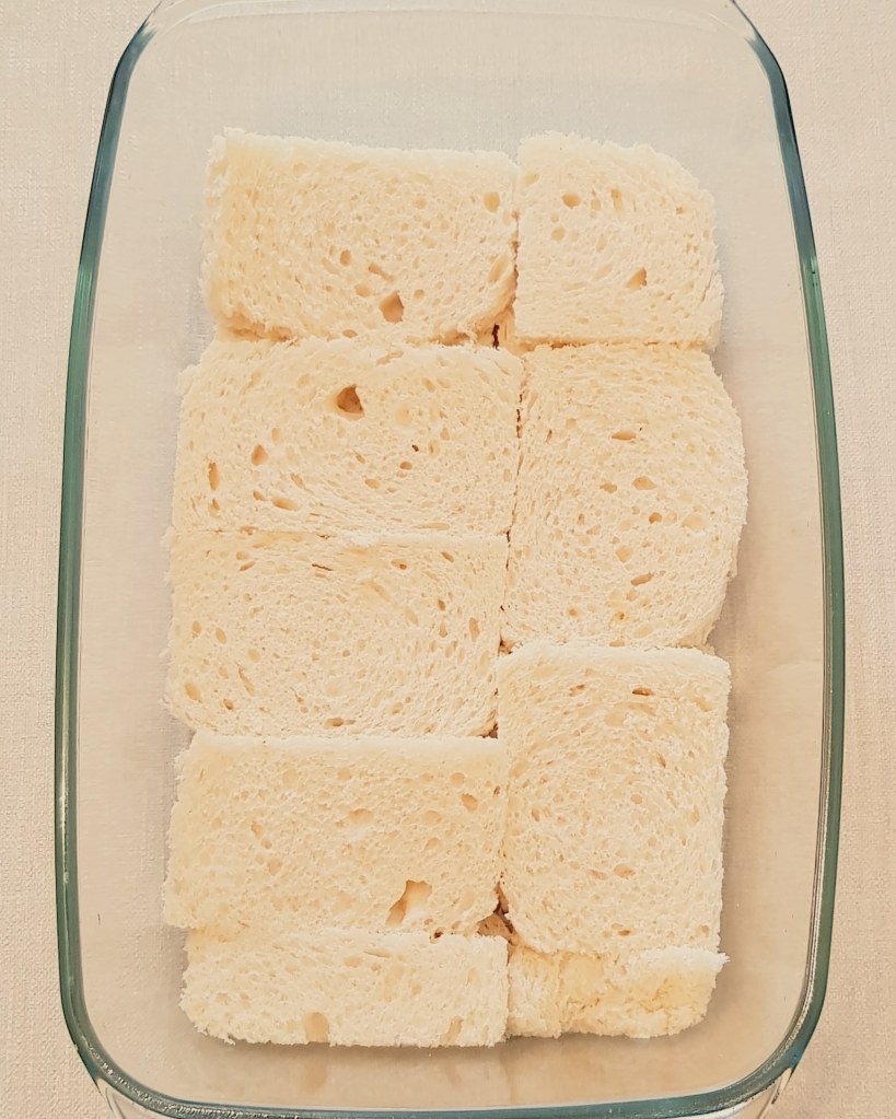 Se decojeste pâinea și se aranjează frumos feliile de pâine într-o tavă pentru copt. Eu am folosit un vas de yena. Pâine a fost suficientă pentru 2 straturi.