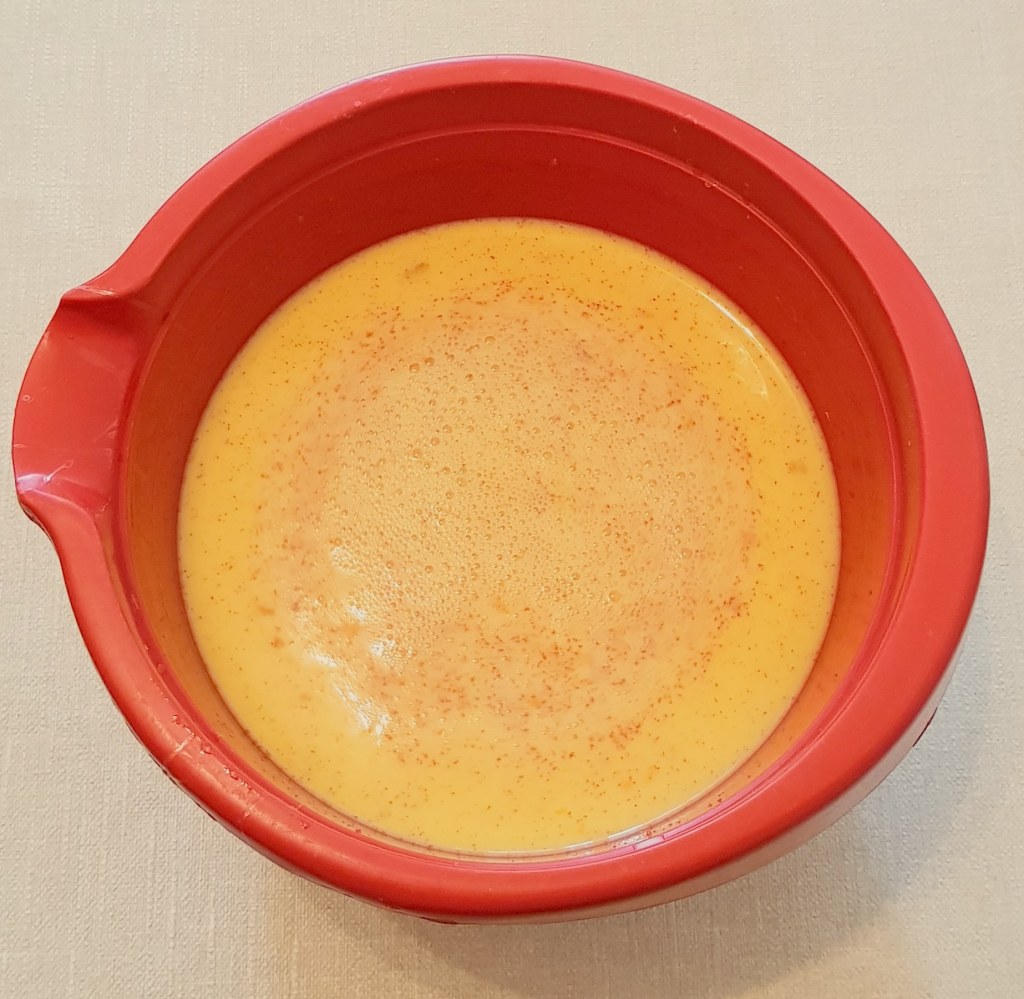 Se sparg ouăle într-un bol și se amestecă cu ajutorul unui tel. Se adaugă laptele, zahărul, scorțișoara și vanilia.