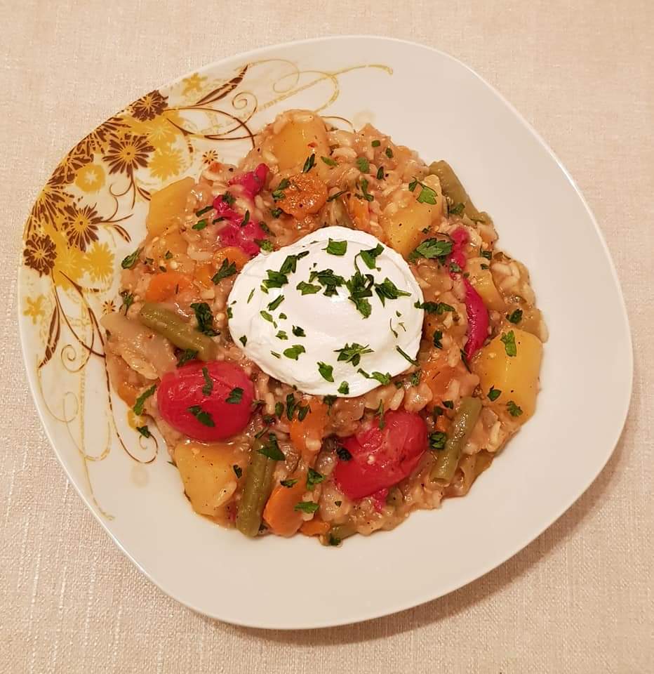 Toate legumele se curăță și se spală. Ceapa am dat-o pe răzătoare. Morcovul, patrunjelul și țelina se taie în funcție de preferințe. Varza se taie cât mai mărunt. Dovlecelul, vânăta și catofii se taie cubulețe. Conopida se desface buchetele mici, ardeiul se taie în funcție de preferințe. Roșiile cherry le-am lăsat întregi. Fasolea verde, din conservă de data aceasta, se pune la scurs. Orezul se spală în 3 ape. Într-o cratiță mai mare se prăjește ceapa în ulei, 1-2 minute. Se adaugă morcovii, pătrunjelul rădăcină și țelina. Apoi se adaugă ardeiul și se lasă puțin la prăjit. Se pune puțină apă și se lasă la fiert sub capac. Între timp tăiați varza și o adăugați. Lăsați puțin varza până se înmoaie, apoi adăugați dovlecelul cubulețe. Adăugați câte un strop de apă dacă este nevoie. Adăugați foile de dafin, puțină sare și piper. După dovlecel adăugați cubulețele de vânătă. Apoi cartofii și după puțin timp buchetelele de conopidă. Fasolea verde pentru că este din conservă am adaugat-o la final. În cazul în care folosiți fasole verde proaspătă ar trebui adăugată după ardei. Cand legumele sunt aproape gata adăugați orezul și roșiile cherry. La final potriviți cu sare și piper și adăugați pătrunjelul verde tocat.