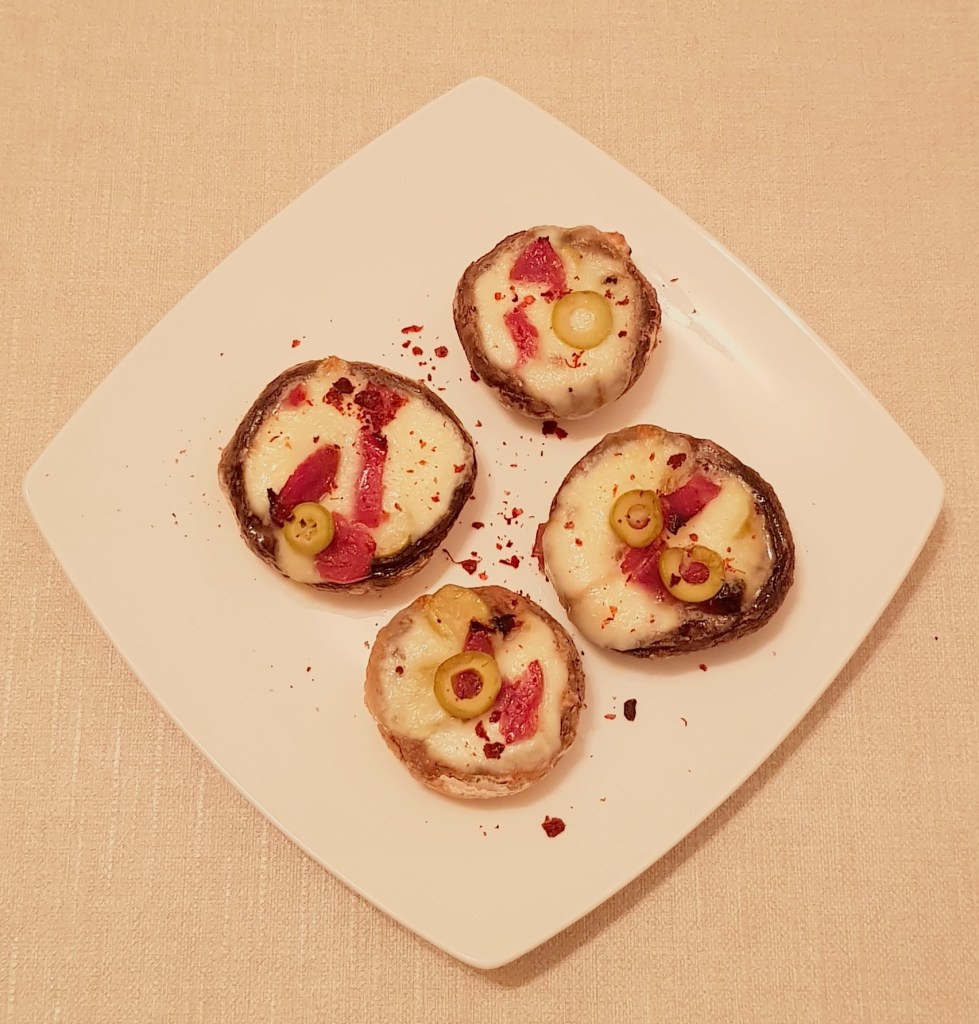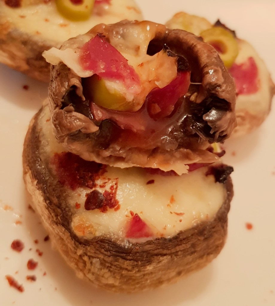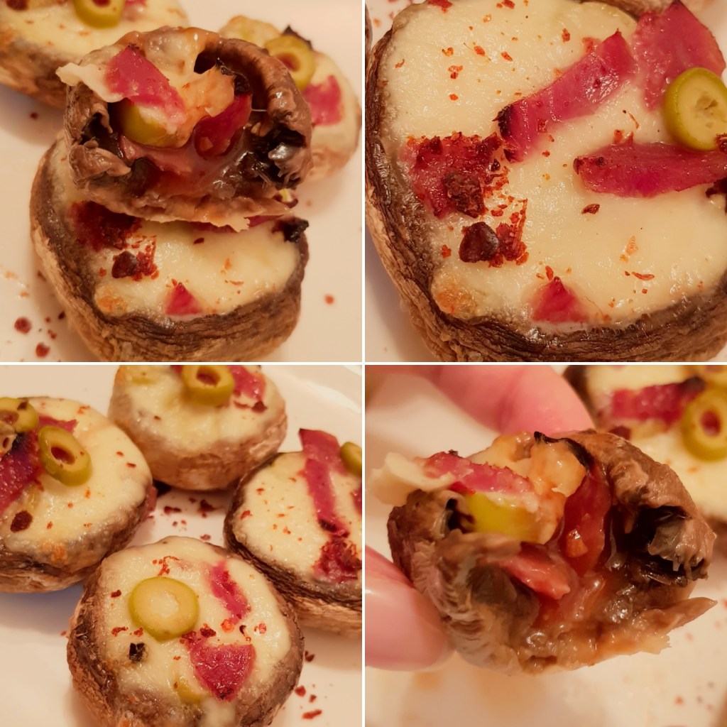 Ciupercile se curăță, se spală, se tamponează cu un șervețel absorbant. Se ung pe ambele părți cu ulei de măsline extra virgin cu ajutorul unei pensule pentru bucătărie. Se sărează și se piperează în funcție de preferințe. Se pun într-o tavă și se pune în fiecare ciupercuță câte o linguriță de ketchup, bucățele de salam și rondele de măsline verzi. Se pun în cuptorul preîncalzit la 180° pentru 10 minute.