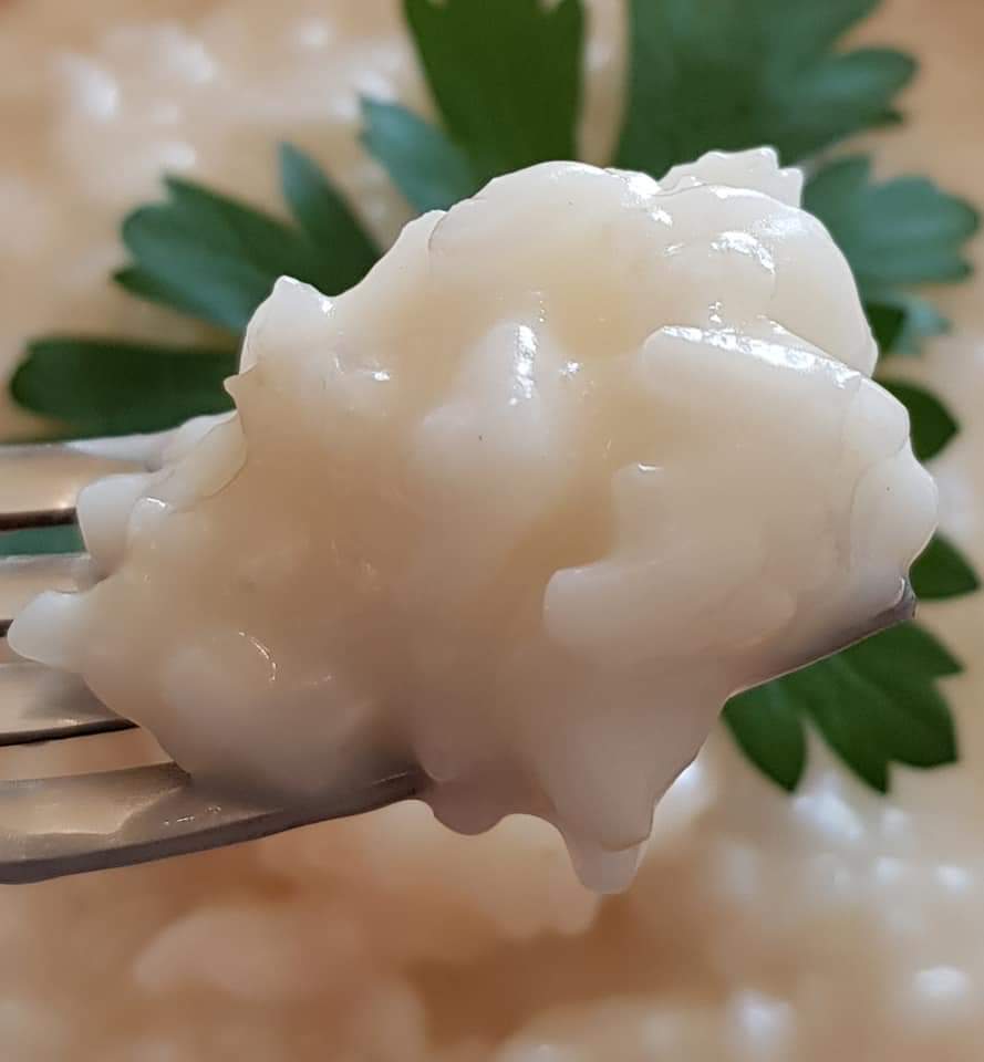 Se încinge uleiul și se lasă usturoiul pisat câteva secunde pentru eliberarea aromei. Se adaugă orezul spălat și se lasă la prăjit 2-3 minute, apoi se adaugă vinul și se amestecă continuu până se evaporă. Se adauga cele 2 căni de apă fierbinte și puțină sare și se lasă la fiert la foc mediu, amestecându-se din când în când. După ce a scăzut apa, se mai adaugă 100ml apă și se mai lasă la foc mic până când scade apa, amestecându-se des. La final se adaugă untul. Se stinge focul, se adaugă parmezanul și se amestecă până când se topește parmezanul. Delicios e puțin spus. Merită să-l încercați! Cantitățile de mai sus sunt suficiente pentru 2 porții 🙂