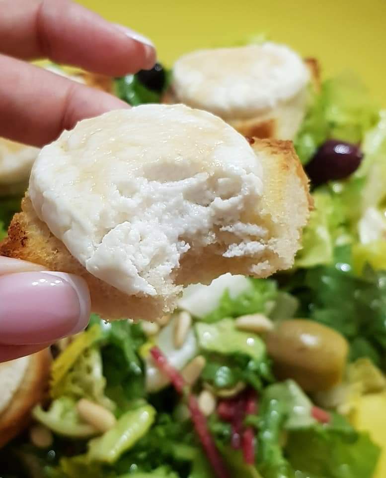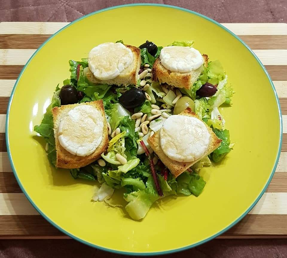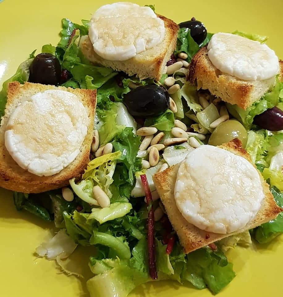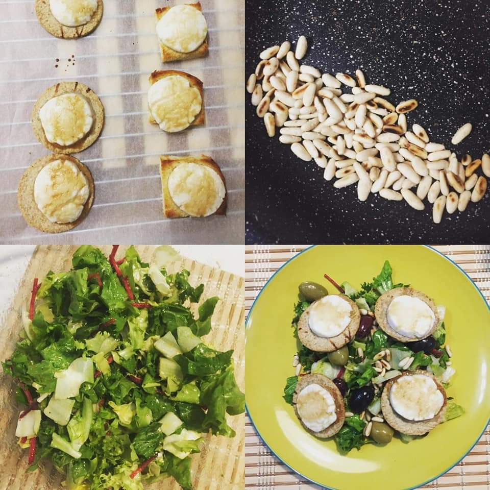 Se feliază brânza proaspătă de capră. Se porționează felia de pâine. Se adaugă câte o felie de brânză proaspătă pe fiecare bucată de pâine și se pun pe o tavă tapetată cu hârtie de copt. Se unge brânza proaspătă de capră cu puțin ulei de măsline și puțină miere și se pune tava în cuptorul preîncălzit la 200° funcția grill pentru 7-8 minute. Pentru dressing se amestecă uleiul de măsline, muștarul, siropul de arțar, oțetul, sarea și piperul. Semințele de pin se prăjesc puțin într-o tigaie cu puțină sare. Într-un bol se amestecă salata cu dressingul. Se aranjează pe o farfurie salata, se adaugă semințe de pin, măsline si toasturile scoase din cuptor.