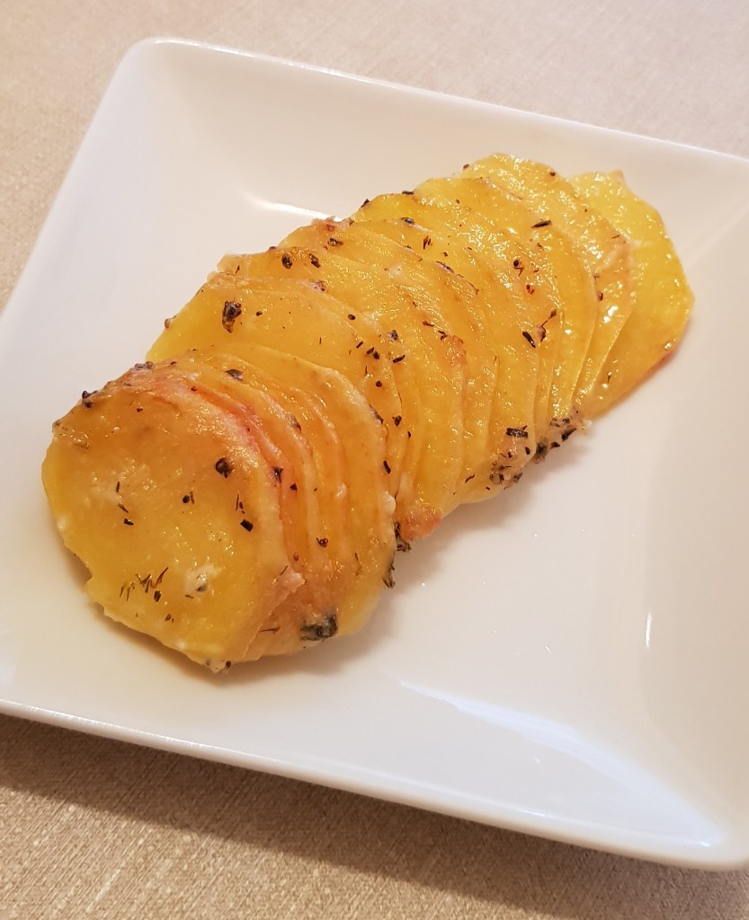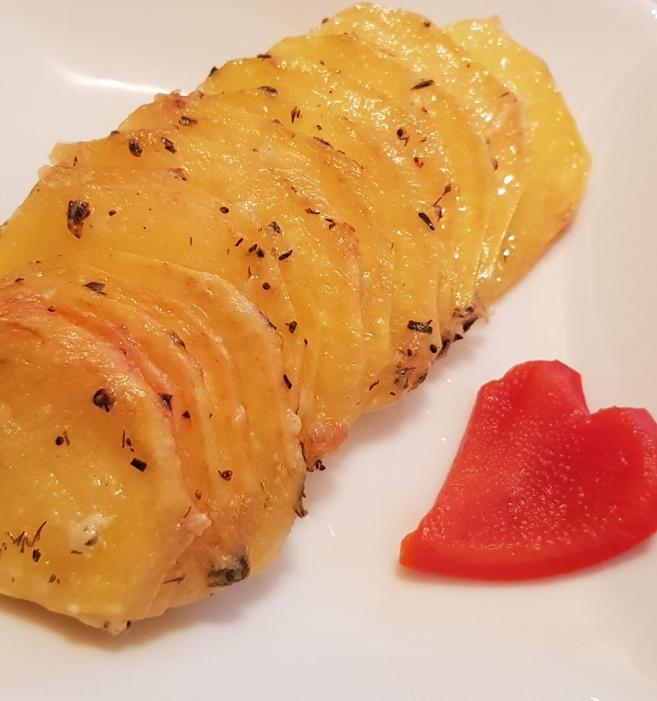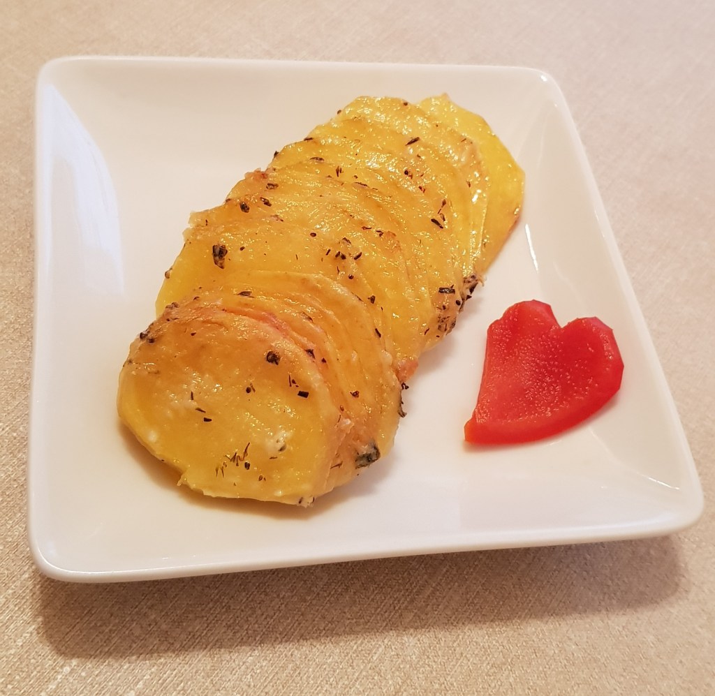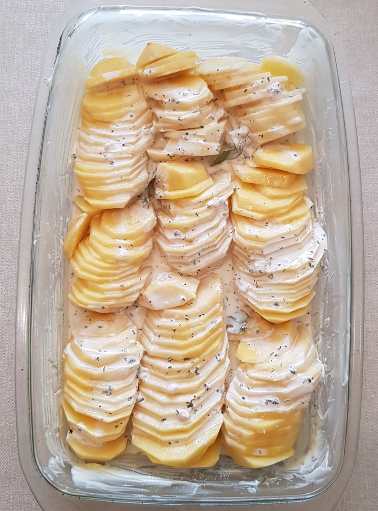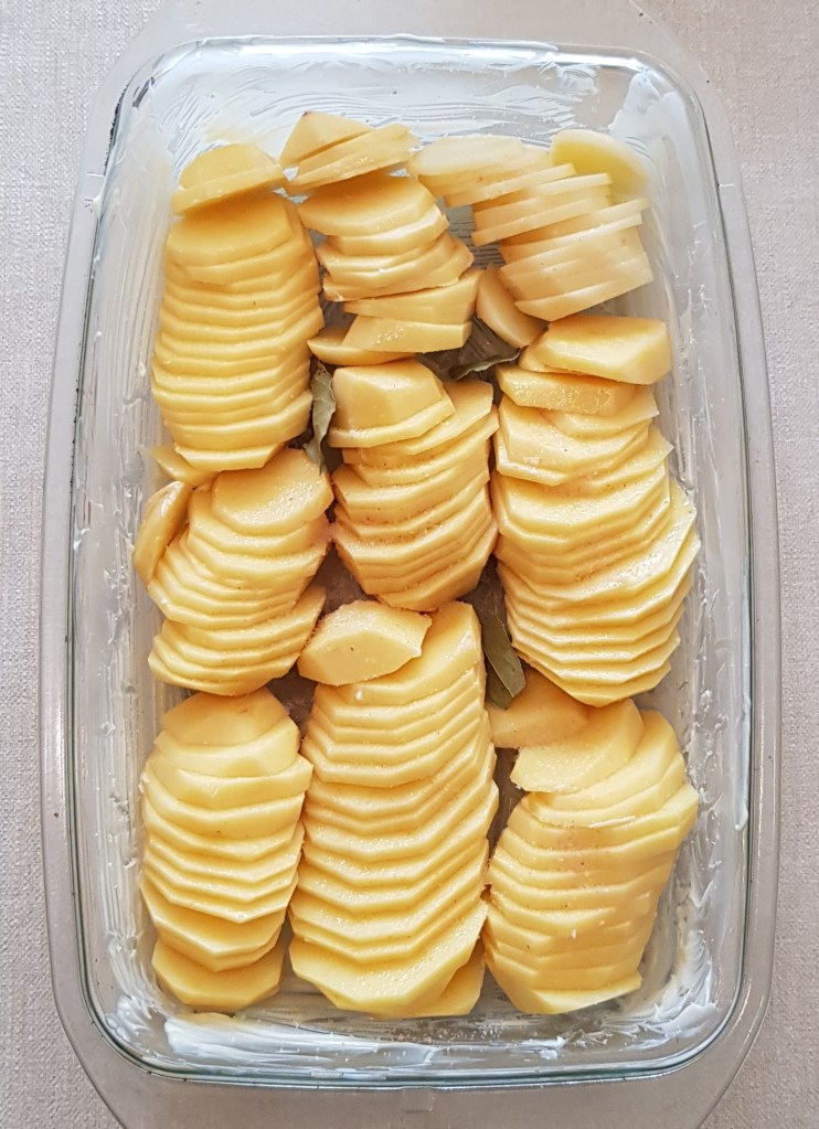 Se unge o tavă cu unt. Eu am folosit un vas de yena. Cartofii se curăță și se spală. Apoi se taie rondele subțiri. Se pun rondelele în tava unsă cu unt. Se pun printre cartofi foile de dafin.