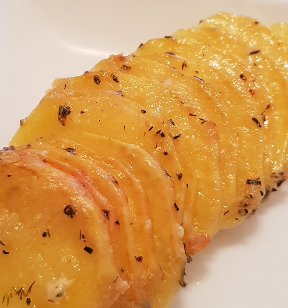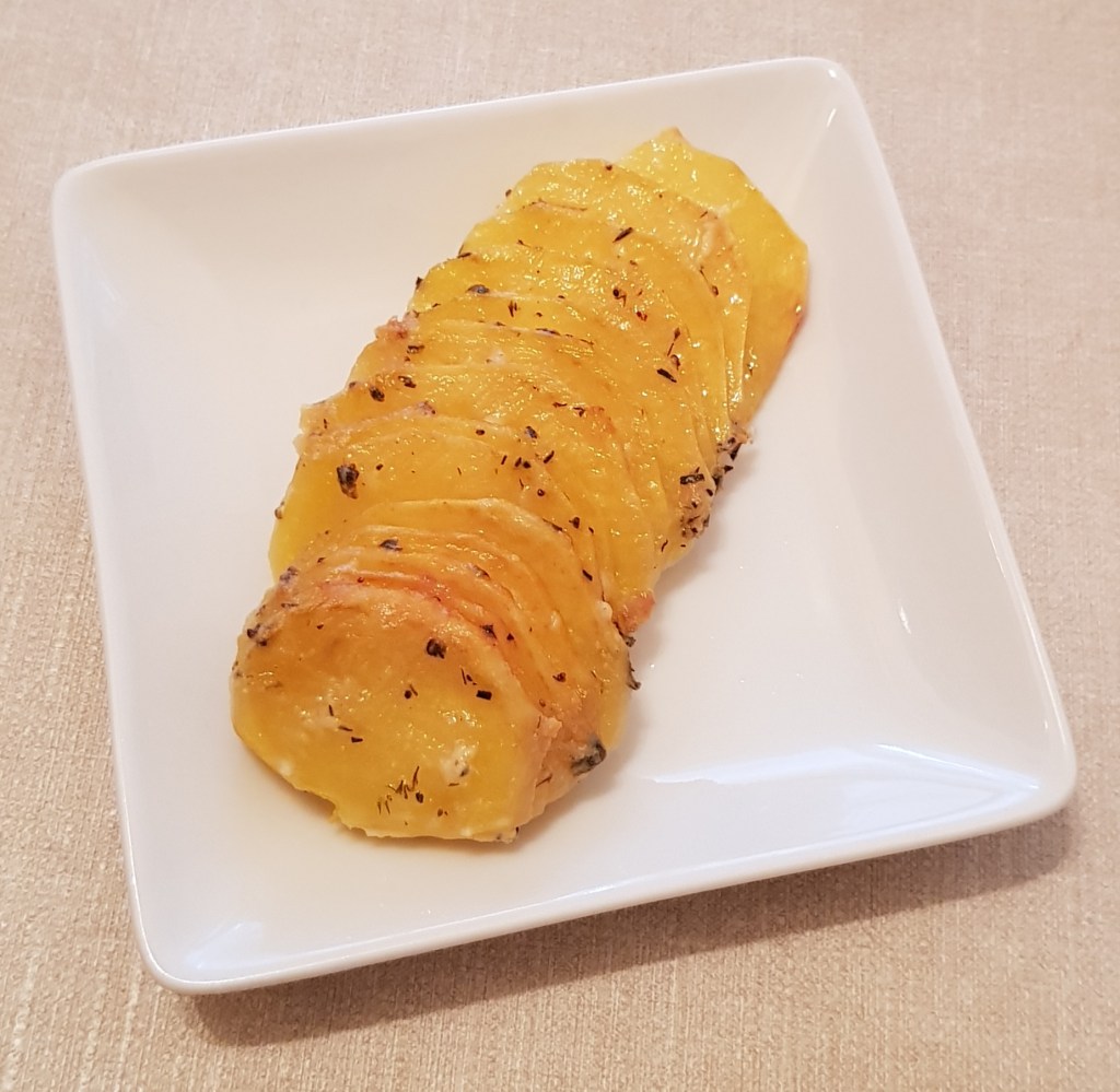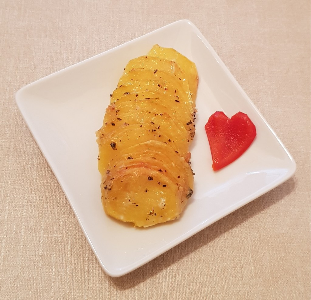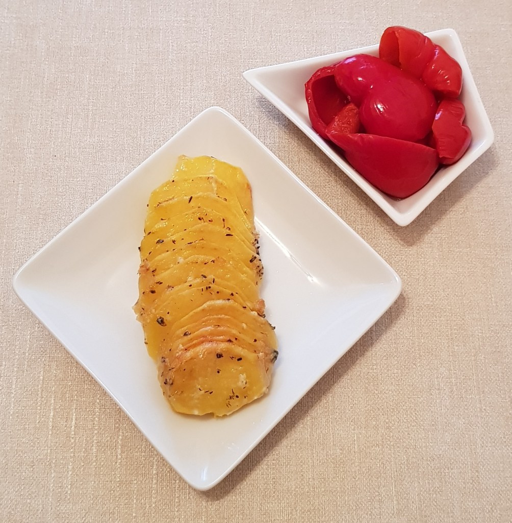 Se unge o tavă cu unt. Eu am folosit un vas de yena. Cartofii se curăță și se spală. Apoi se taie rondele subțiri. Se pun rondelele în tava unsă cu unt. Se pun printre cartofi foile de dafin.