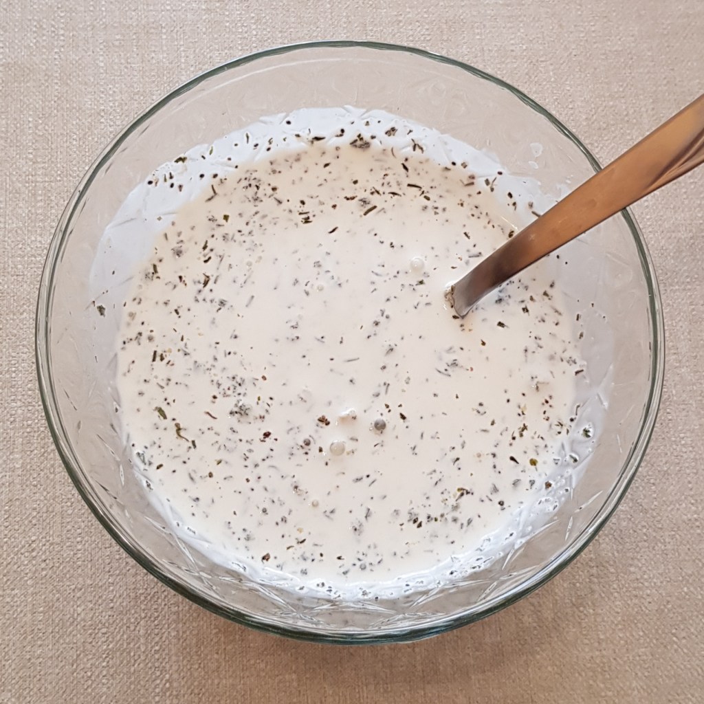 Se sărează și se piperează cartofii în funcție de preferințe. Într-un bol se amestecă smântâna pentru gătit cu sare, piper și cimbru.