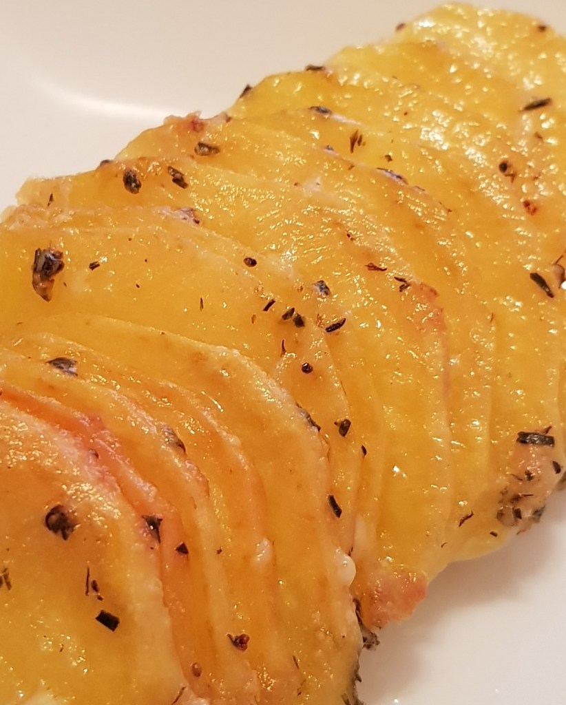 Se toarnă amestecul de smântână și condimente peste cartofi. Se pune tava în cuptorul preîncălzit la 180° pentru o oră.