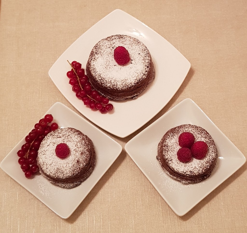 Azi am făcut Lava Cake pentru a doua oară. Recunosc nu sunt fanul prăjiturilor cu ciocolată, dar am un „iepuraș” care adoră doar prăjiturile cu ciocolată 😊 Și pentru că nu am făcut de multă vreme Lava Cake, și pentru că nu am pe blog această prăjiturică, bineînțeles că am făcut și poze 😊 În timp ce mi-am pregătit ingredientele și compoziția, i-am explicat băiețelului meu de 5 ani, „iepurașul”, ce fel de prăjiturică îi voi face… un mic vulcan din care va curge o lavă fierbinte de ciocolată 🙂 Băiețelul meu super încântat nu s-a dezlipit de lângă ușă cuptorului cele 14 minute petrecute de prăjiturele în cuptor. Apoi a rezistat cu greu să le scoatem din forme, să le decorăm și să le facem poze… Și apoi a sunat telefonul… un telefon foarte important la care nu am avut cum să nu răspund… 😅 M-am refugiat în dormitor pentru a vorbi în liniște la telefon și când m-am întors în bucătărie am avut o mică surpriză… niște Lava Cake-uri fără lavă și un „iepuraș” cu musteți de ciocolată 😊 M-am gândit să postez totuși Lava Cake-urile așa întregi și „fără lavă” sunt prea frumoase 🙂 și… promit… următoarele Lava Cake-uri le voi posta „cu lavă”, dar nu foarte curând… prea multă ciocolată 😊