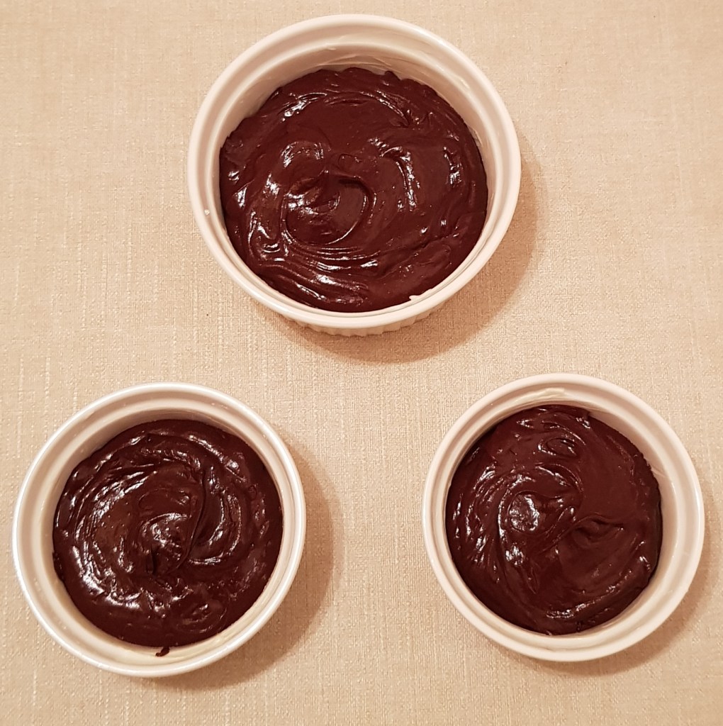 Untul se mixează cu zahărul foarte bine. Se adaugă pe rând câte un ou, amestecându-se bine după fiecare cu ajutorulu unui tel. Se adauga esența de vanilie și făina. Se amestecă pentru omogenizare. Ciocolata se topește la bain-marie sau în cuptorul cu microunde. Se adaugă peste compoziție siși se amestecă pentru omogenizare. Apoi se împarte compoziția în forme ramekin unse cu unt (aveți nevoie de 4 forme mici). Eu am folosit 2 forme mici și una mare. Se pun formele în cuptorul preîncălzit la 200° pentru 14 minute.