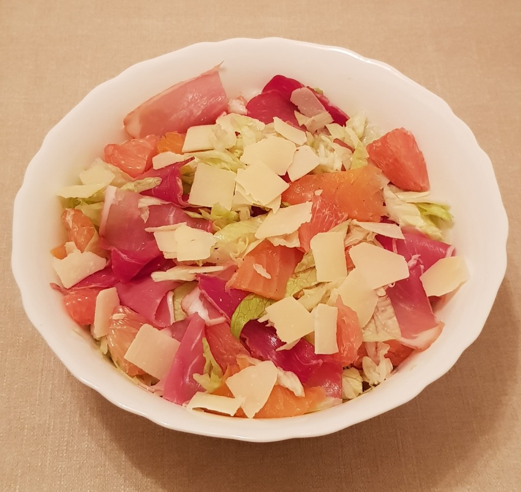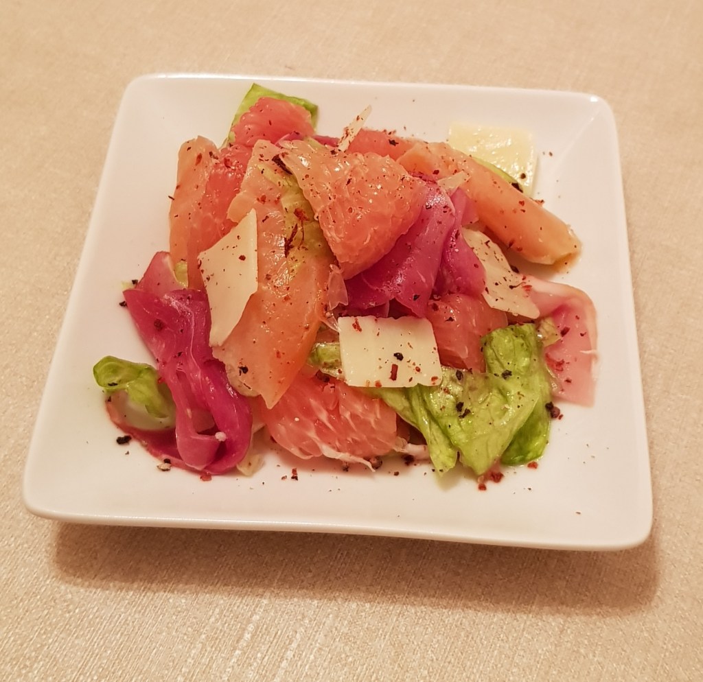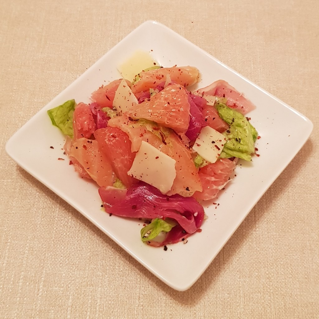 Salată cu pomelo roșu, somon afumat, șuncă și parmezan 😋