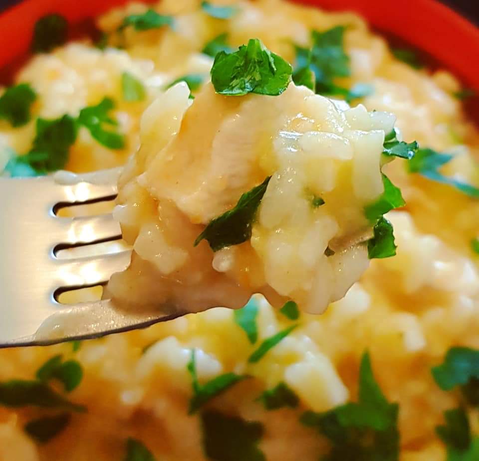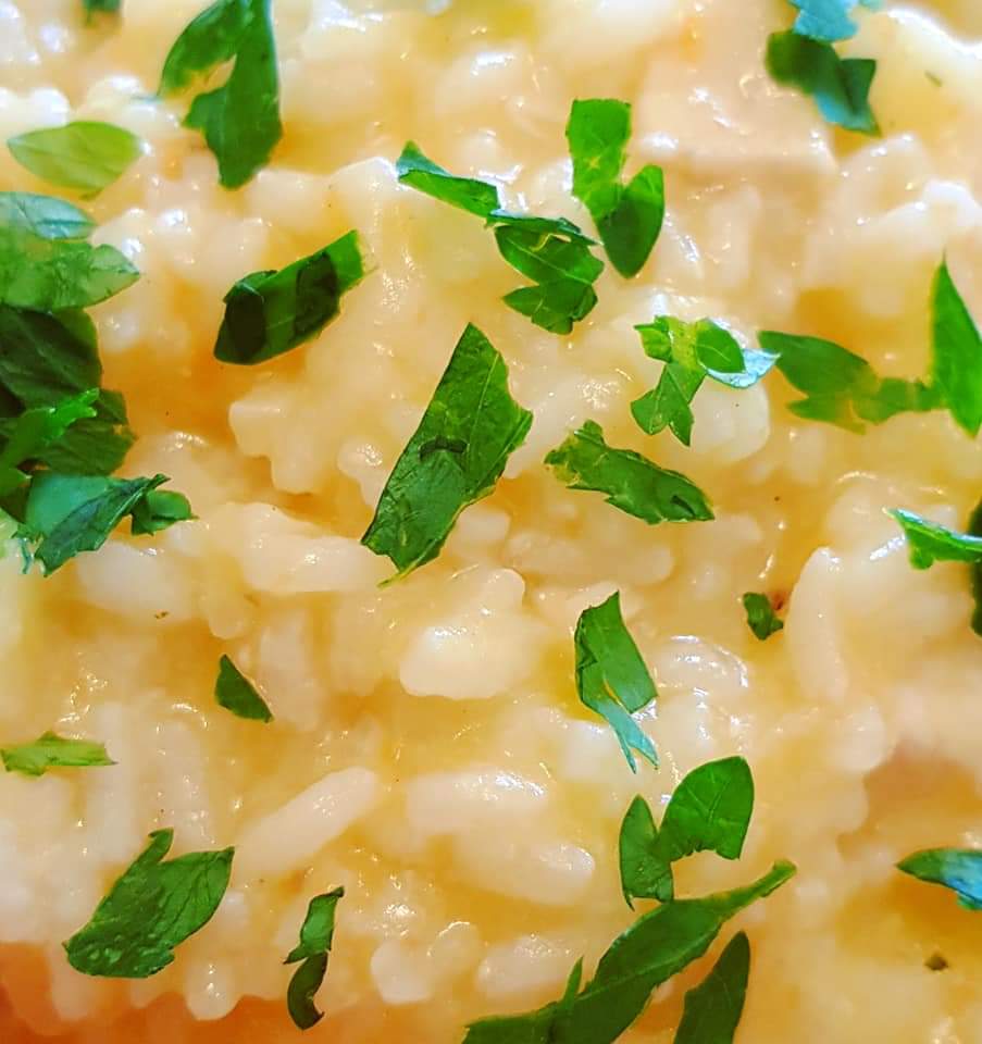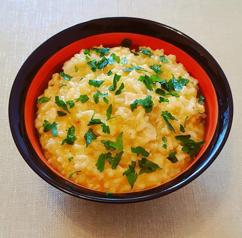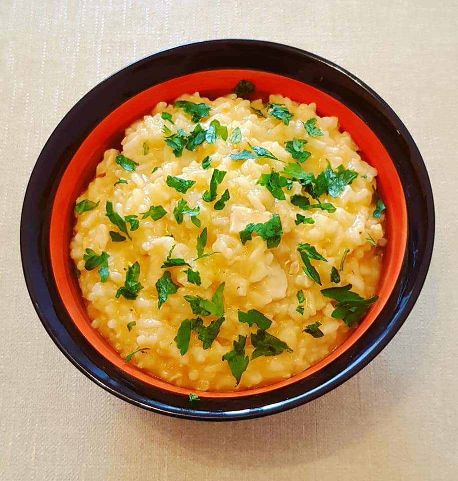 Într-o cratiță se sotează usturoiul pisat în uleiul de măsline pentru un minut. Se adaugă morcovul ras și se mai lasă 2 minute. Apoi se adaugă orezul spălat în prealabil în 3 ape. Se adaugă vinul alb și se lasă câteva minute până când se evaporă vinul, amestecandu-se des. Vinul alb adăugat la risotto, îi conferă acestuia o textură cremoasă. După evaporarea vinului se adaugă supa de legume fierbinte sau apa și se lasă la fiert la foc mic, amestecandu-se din când în când până cand se absoarbe, iar orezul este gătit. Se adaugă sare și piper în funcție de preferințe. La final, când orezul e gata, se adaugă untul și se amestecă foarte bine. Se ornează cu pătrunjel verde tocat.