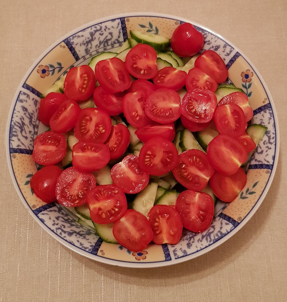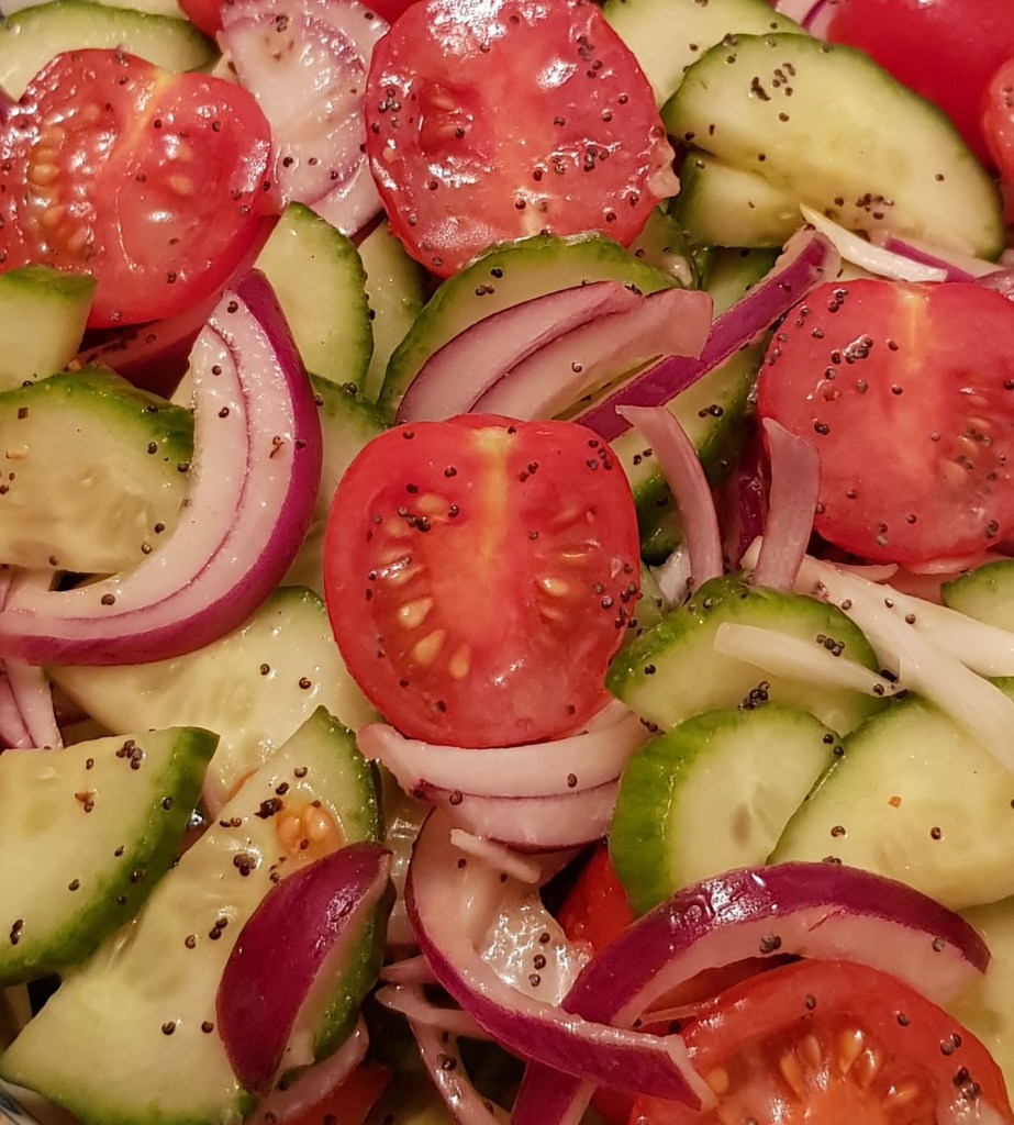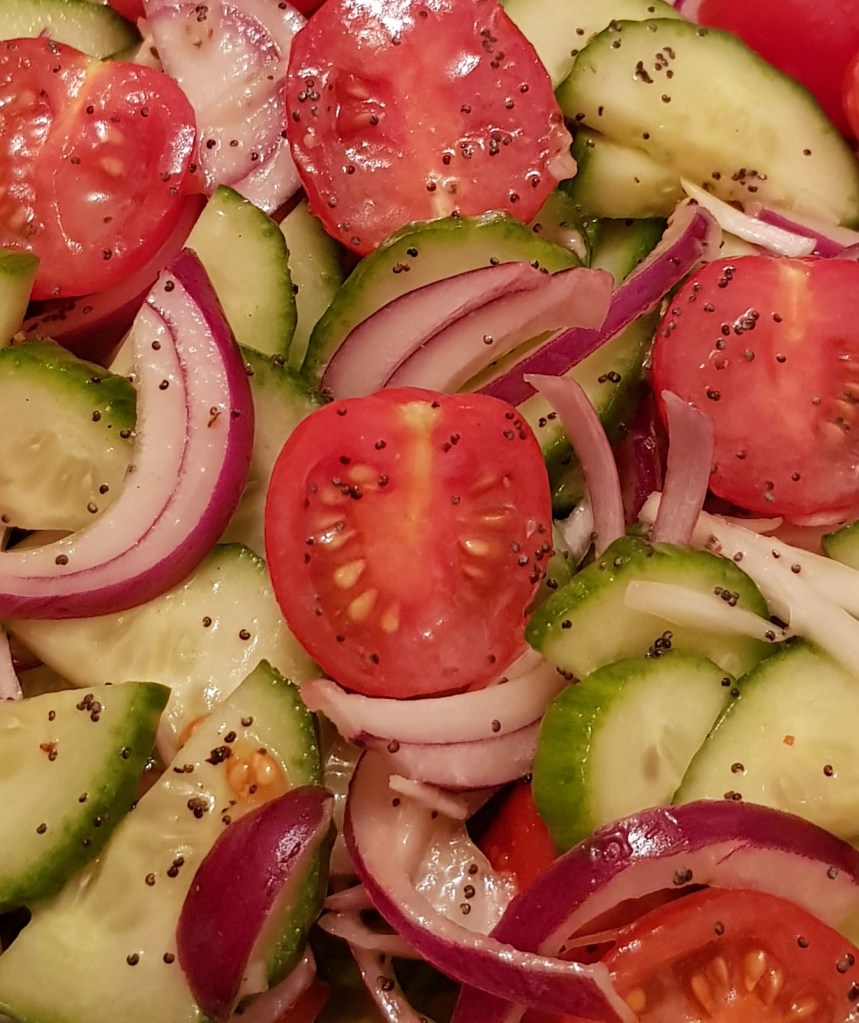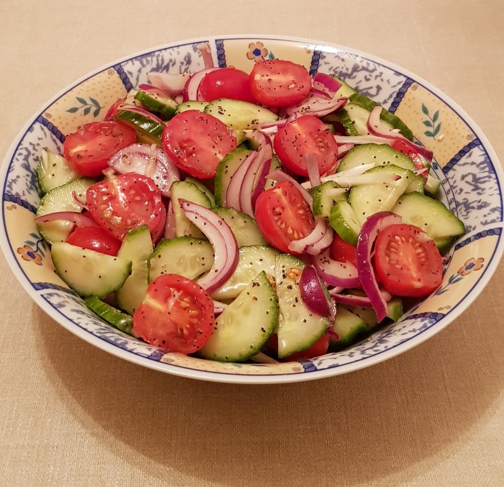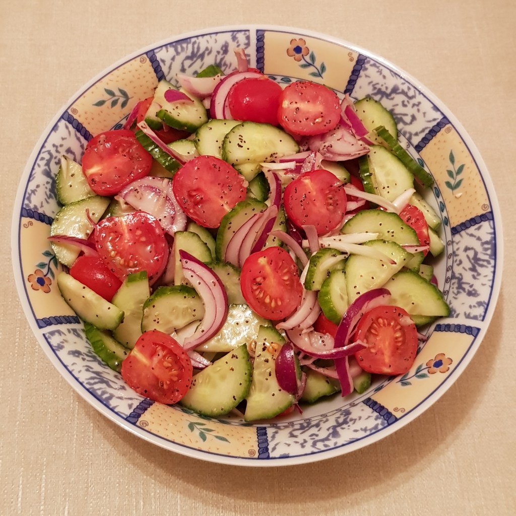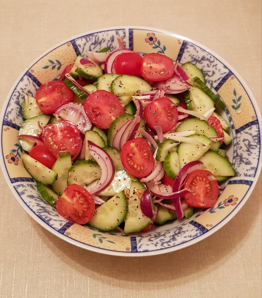 Salată de castraveți, roșii cherry, ceapă roșie și un dressing delicios 😋