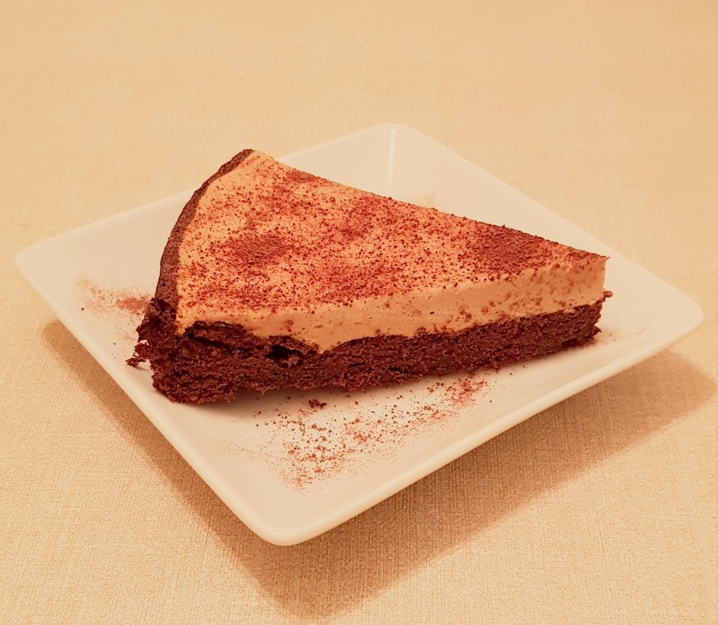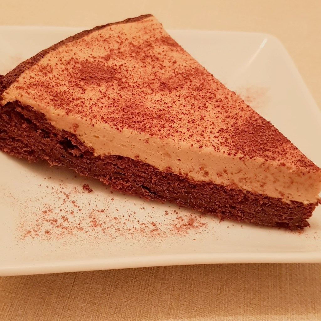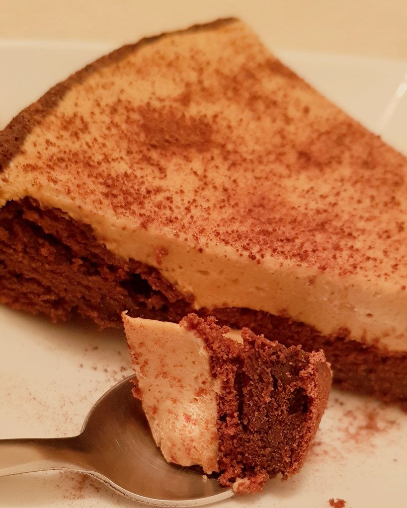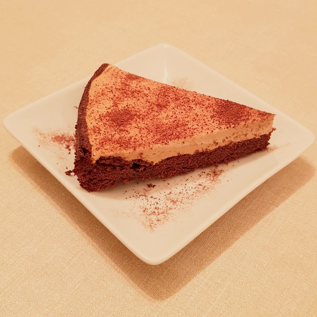 Se pune tava în cuptorul preîncălzit la 180° pentru 25 de minute. Când tortul de ciocolată e copt, se scoate și se lasă la răcit la temperatura camerei. Cât timp blatul se răcește se prepară mousse-ul de cafea. Se mixează gălbenușurile cu zahărul până când devin cremoase și primesc o culoare galben deschis. Se adaugă amidonul de porumb și se amestecă, apoi se adaugă puțin câte puțin din laptele cald. Apoi se pune compoziția într-o cratiță pentru sosuri. Se pune la foc mic și se lasă până când fierbe și se îngroașă, amestecând continuu. Apoi se ia de pe foc și se adaugă esența de vanilie și nesul. Se amestecă pentru omogenizare. Apoi se pune la răcorit. Se mixează smântână pentru frișcă neîndulcită până când se formează vârfuri rigide. Între timp se amestecă gelatina cu cele 2 linguri de apă rece și se lasă timp de 10 minute, apoi se pune la foc mic și se lasă puțin până se topește. Se adaugă gelatina în compoziția de cafea. Se amestecă pentru omogenizare. Apoi se încorporează frișca cu ajutorul unei palete și se amestecă ușor până se omogenizează compoziția. Se pune mousse-ul de cafea peste blatul de ciocolată. Se nivelează ușor.