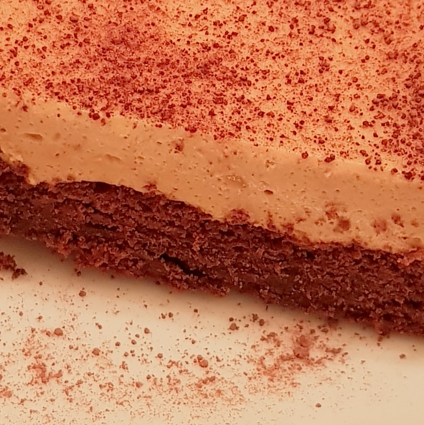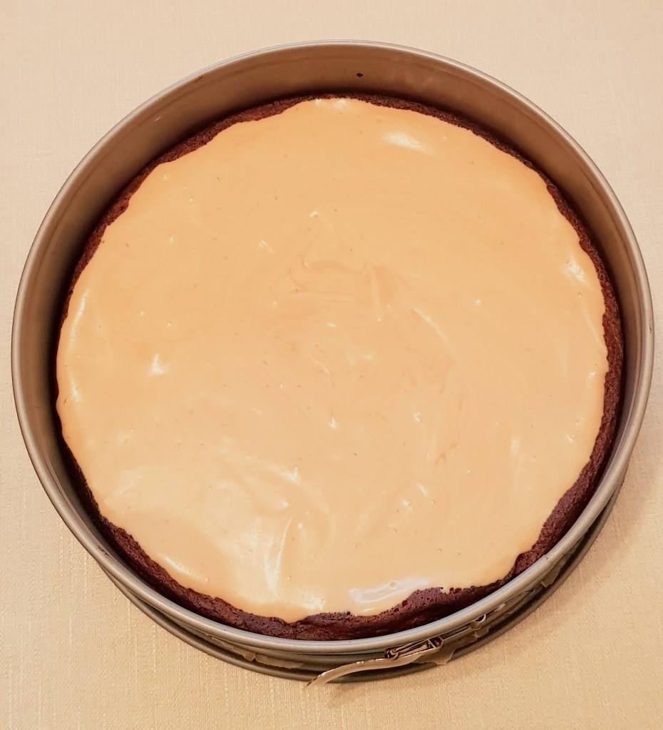 Mai întâi se prepară blatul de ciocolată. Se separă ouăle. Ciocolata și untul se topesc la bain marie sau se pun într-un bol în cuptorul cu microunde pentru 2 minute, apoi se amestecă pentru omogenizare și se lasă puțin la răcorit. Albușurile se mixează cu ajutorul unui mixer până se formează spuma, apoi se adaugă pe rând câte o lingură de zahăr până se formează vârfuri tari. După ce s-a răcorit puțin ciocolata topită se mixează cu un mixer adăugându-se pe rând câte un galbenuș, apoi cacao și praful de sare. Se încorporează spuma de albușuri în compoziția de ciocolată amestecându-se ușor cu o spatulă de sus în jos. Apoi se pune compoziția într-o formă de copt cu pereți detașabili, tapetată cu hârtie de copt.