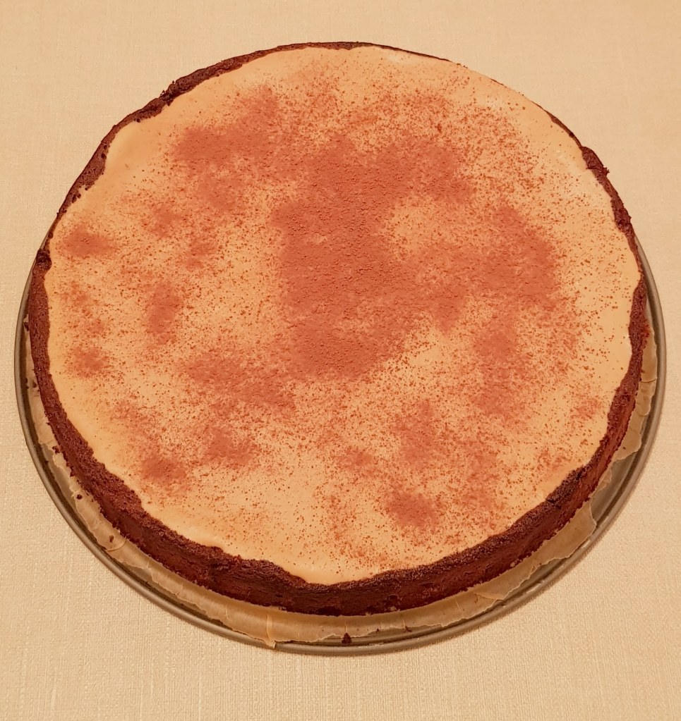 Se acoperă tava cu folie alimentară, apoi se pune în frigider pentru minim 4 ore sau peste noapte. Pentru decor am folosit o linguriță de cacao Nesquik.