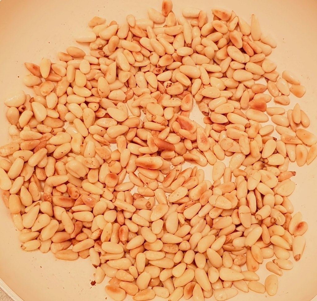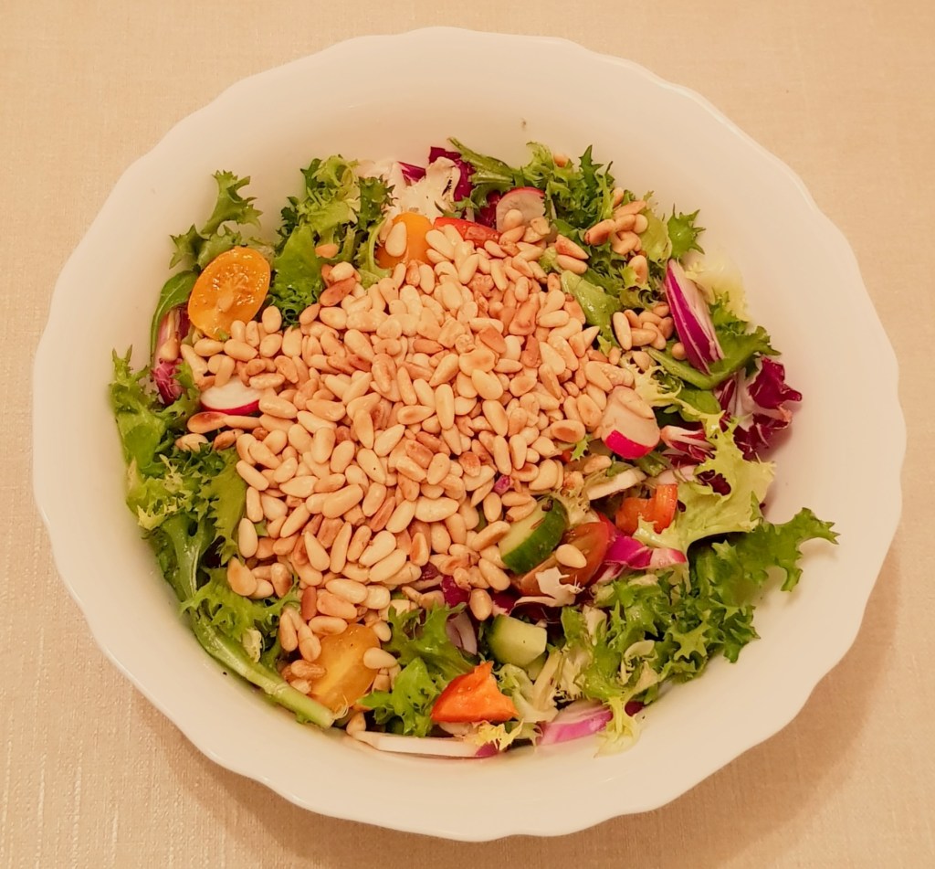 Mugurii de pin se pun într-o tigaie fără ulei și se prăjesc câteva minute până se rumenesc ușor, appi se adaugă peste salată.
