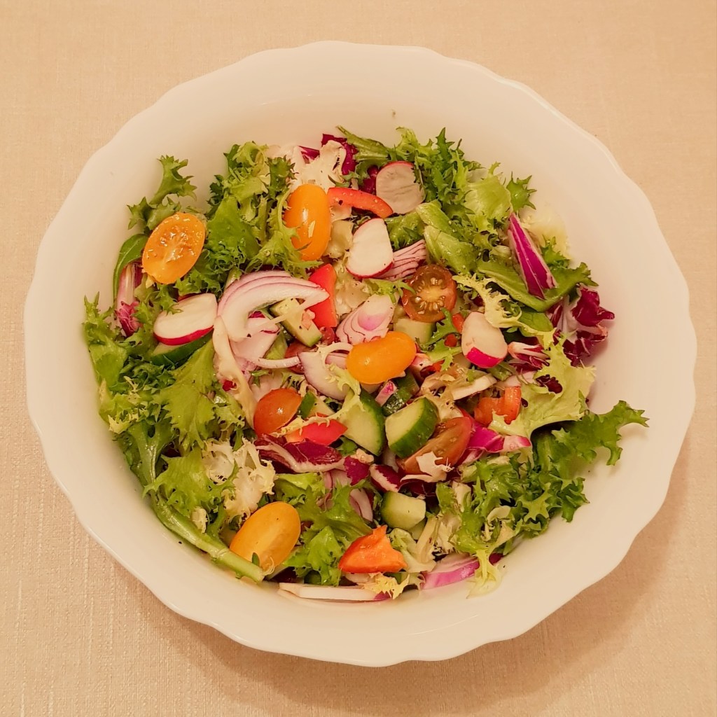Într-un bol se pune salata și se adaugă ridichile tăiate rondele, ardeiul tăiat cubulețe, roșiile cherry tăiate jumătăți, ceapa roșie tăiată peștișori și castravetele tăiat în sferturi.