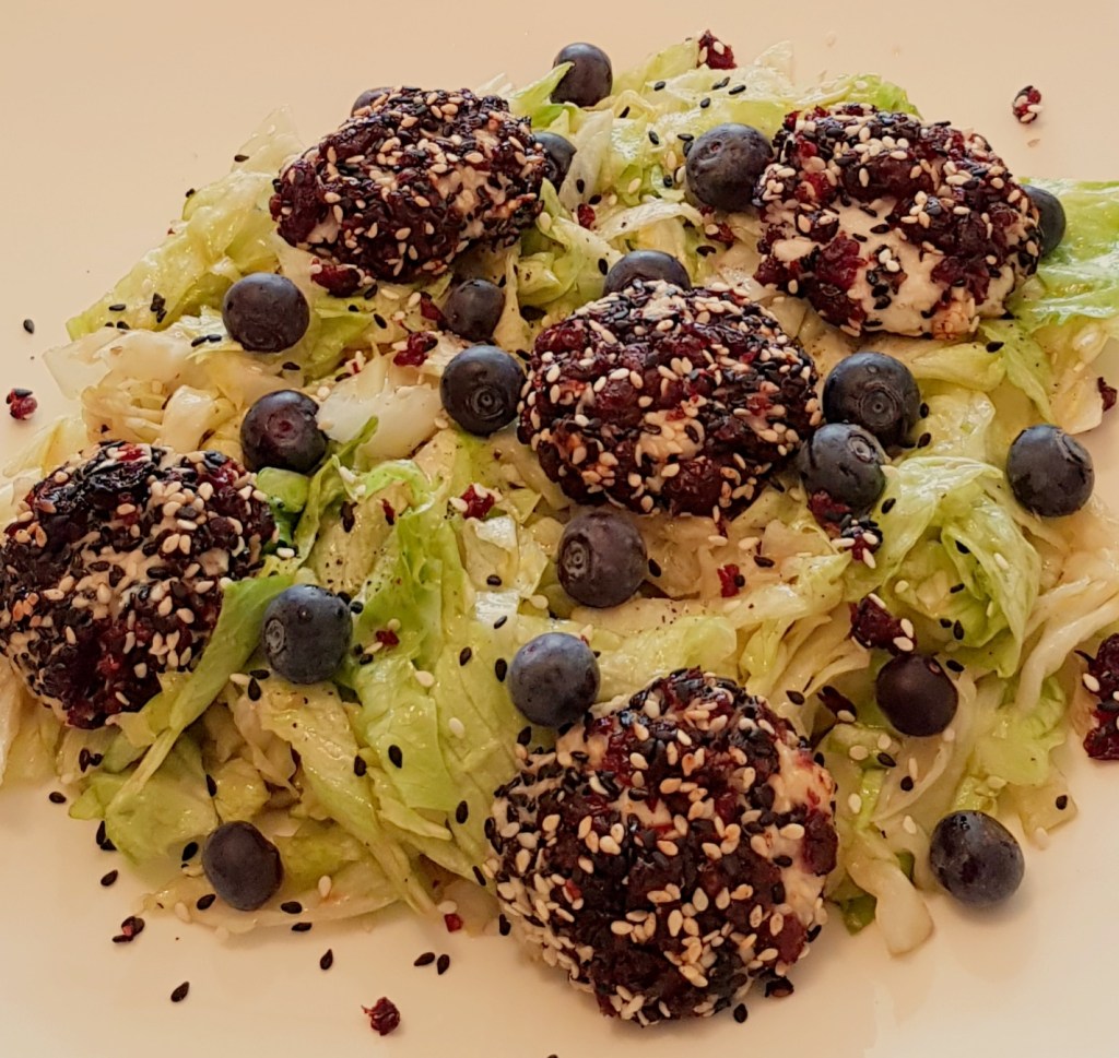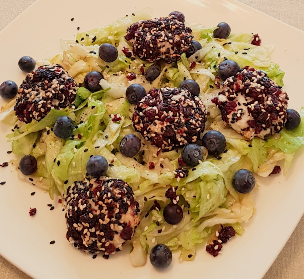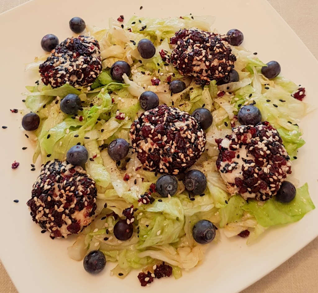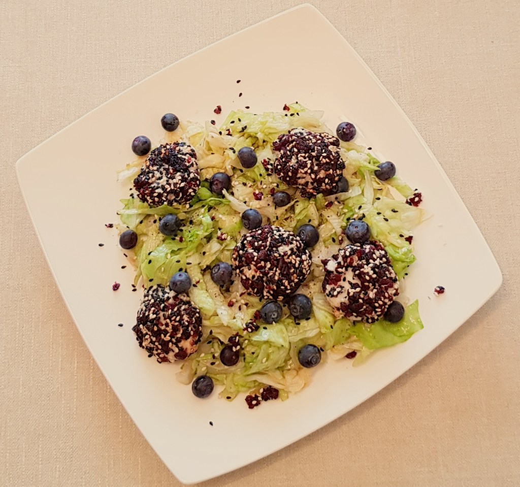 Între timp se taie salata iceberg fâșii. Se prepară un dressing din uleiul de măsline extra virgin, mierea de albine, oțetul balsamic, sare și piper în funcție de preferințe. Se toarnă dressingul peste salată. Se adaugă afinele și se amestecă pentru omogenizare. Apoi se scot biluțele de brânză din cuptor și se adaugă peste salată. Delicios 😋