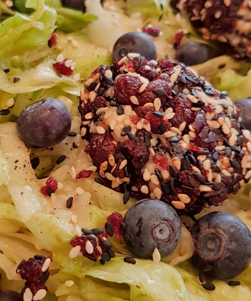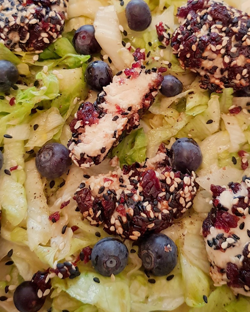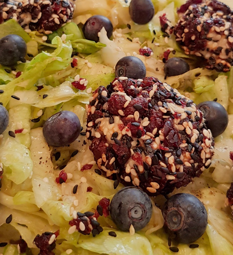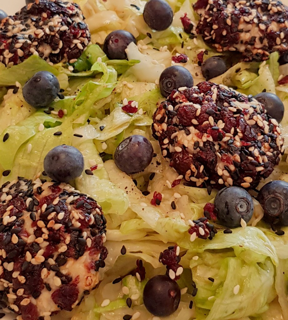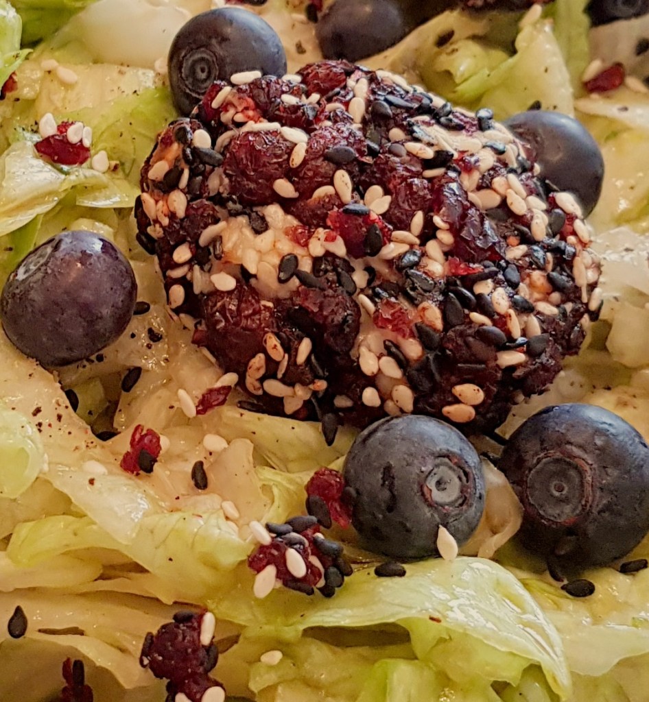 Între timp se taie salata iceberg fâșii. Se prepară un dressing din uleiul de măsline extra virgin, mierea de albine, oțetul balsamic, sare și piper în funcție de preferințe. Se toarnă dressingul peste salată. Se adaugă afinele și se amestecă pentru omogenizare. Apoi se scot biluțele de brânză din cuptor și se adaugă peste salată. Delicios 😋