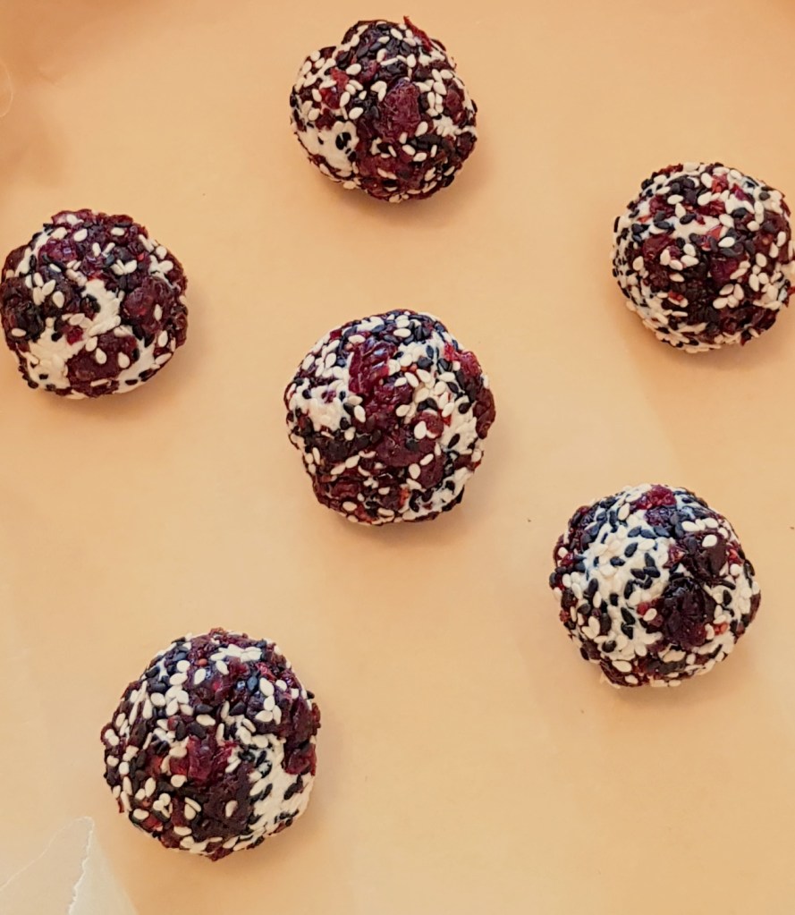 Brânză proaspătă de capră se face biluțe și se trece printr-un amestec de susan alb, negru și merișoare confiate măcinate. Apoi se pun biluțele într-o tavă tapetată cu hârtie de copt și se pune în cuptorul preîncălzit la 250° pentru 5 minute sau până când începe să se topească ușor brânza.