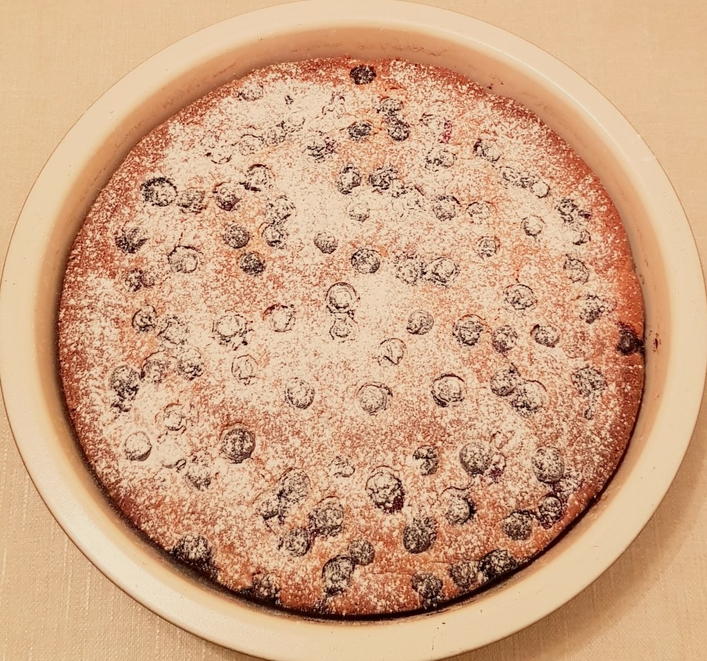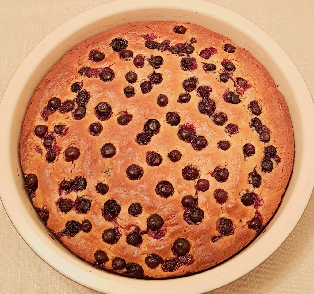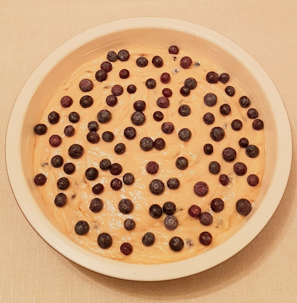 Apoi se adaugă afinele păstrate peste compoziție. Se pune tava în cuptorul preîncălzit la 180° și se reduce temperatura la 160°. Se coace prăjitura timp de 50 de minute.