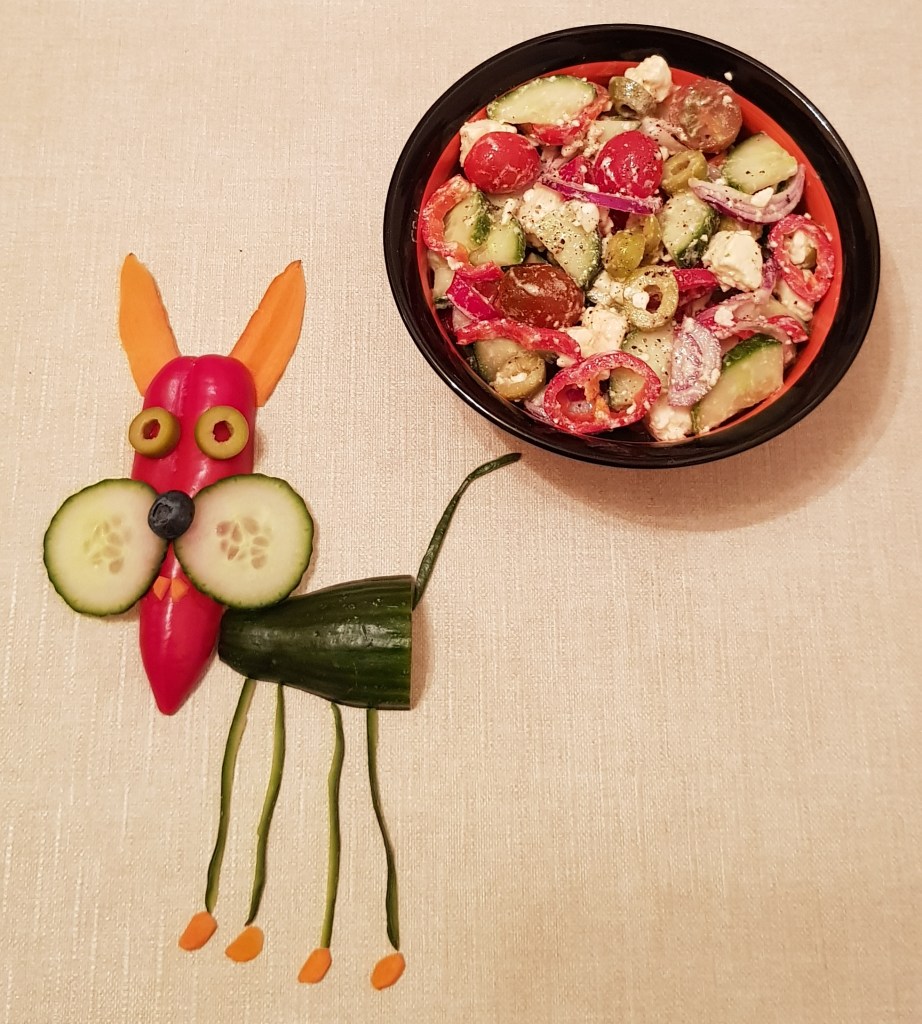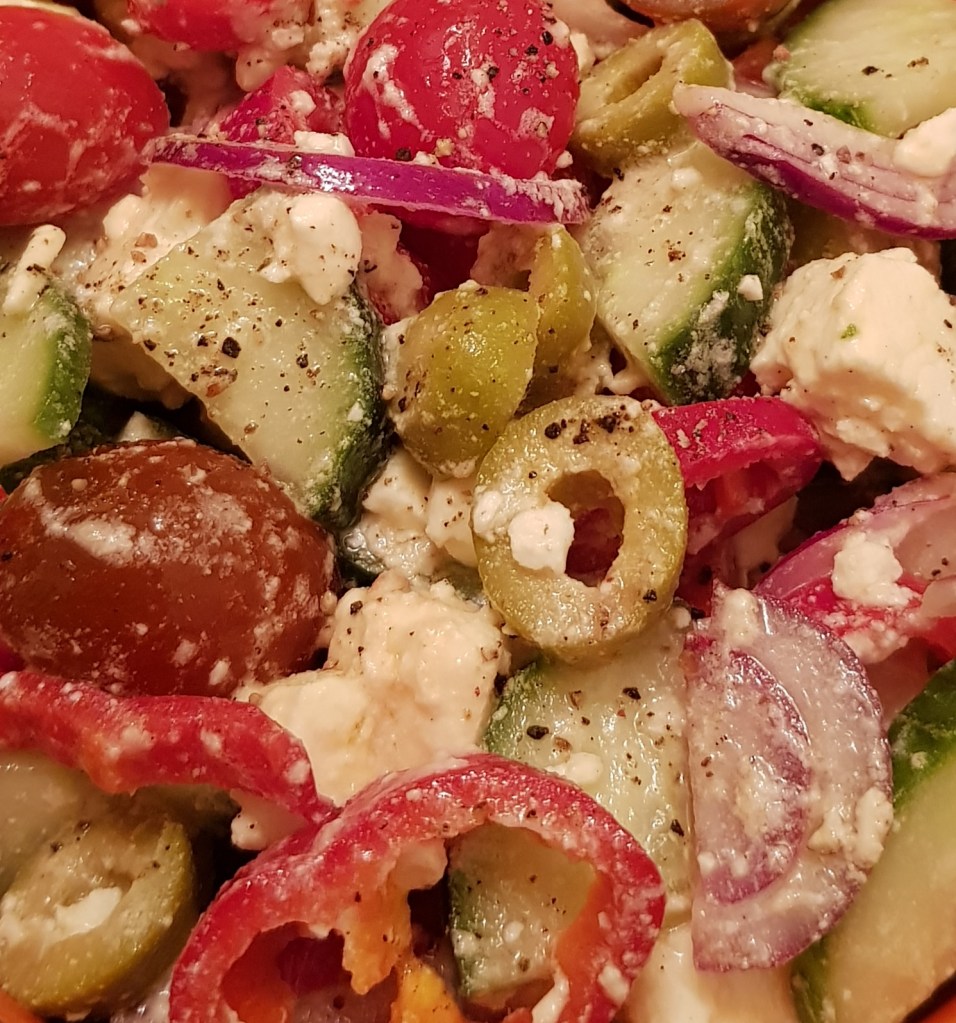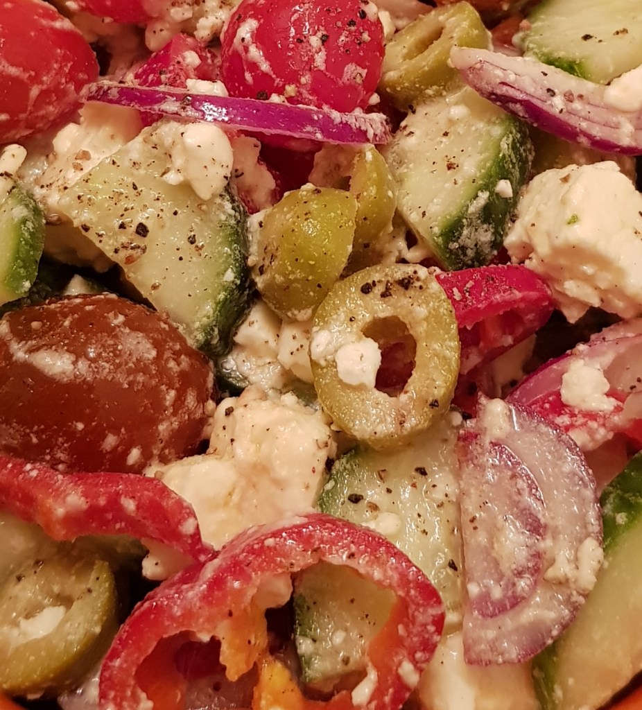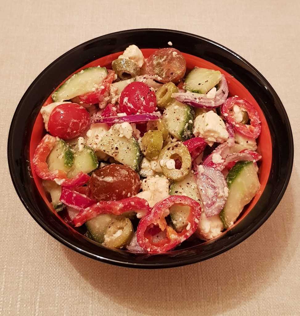 Într-un bol se pun roșiile cherry tăiate jumătăți, castravetele tăiat sferturi, ceapă roșie tăiată peștișori, ardeiul tăiat rondele, măslinele verzi fără sâmburi tăiate rondele. Se adaugă brânza telemea tăiată cubulețe. Într-un bol se amestecă uleiul de măsline, sucul de lămâie, sare roz de Himalaya și piper mozaic proaspăt măcinat. Se adaugă dressingul peste salată și se amestecă pentru omogenizare.