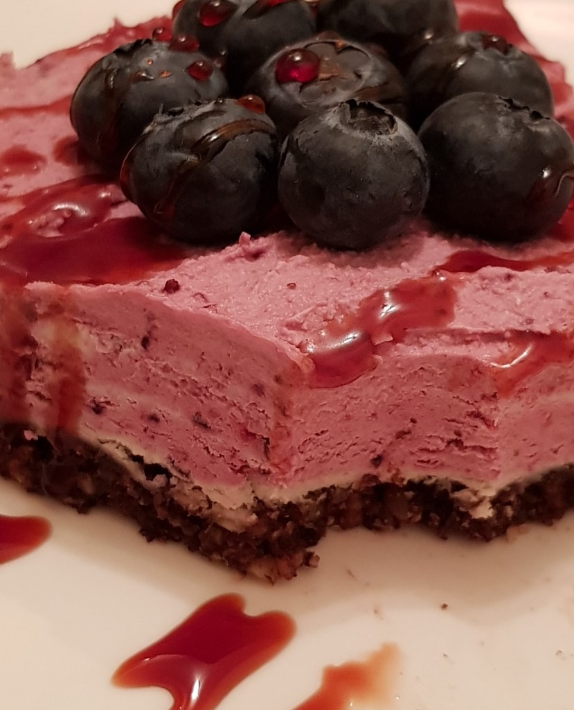Se acoperă tava cu o folie alimentară și se pune în congelator pentru minim 2 ore. Înainte de feliere se scoate cu 30 de minute din congelator. Se decorează cu fructe proaspete. Eu am ales afinele pentru decor și un sos de curmale bio. Se păstrează până la o lună în congelator, dacă rezistați atât timp. Un desert delicios și sănătos 😋