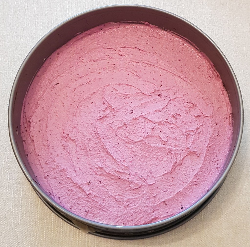 Pentru cremă se hidratează caju-ul minim 4 ore sau cel mai bine peste noapte. Apoi se scurge de apă și se pune în vasul unui blender. Se adaugă mierea, sucul de lămâie, uleiul de cocos topit, vanilia. Se procesează până se obține o cremă. Apoi se pune jumătate din crema obținută într-un bol. Se adaugă fructele de pădure congelate peste restul de cremă și se procesează din nou. Apoi se toarnă cele 2 creme alternativ peste blat.