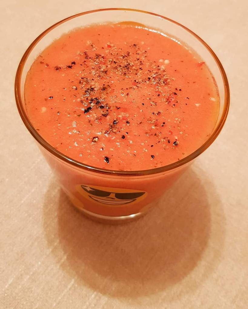 Și pentru că am făcut Guacamole și nu am folosit miezul roșiilor, am făcut un „Bloody Mary” reinterpretat, fără alcool, cu busuioc, ghimbir și muuult piper. Și pentru că a ieșit delicios, m-am gândit să îl includ în categoria Bauturi a acestui blog 🙂