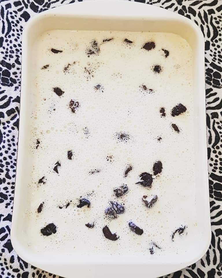 Pentru blat se sfărâmițează biscuiții oreo cu ajutorul unui robot de bucătărie, apoi se amestecă cu untul topit.Se tapetează o tavă cu pereți detașabili cu hârtie de copt și se înfășoară foarte bine cu folie de aluminiu partea de jos a tăvii. Se presează ușor blatul de biscuiți oreo. Apoi se prepara crema. Se mixează crema de brânză cu zahărul. Se adaugă pe rând câte un ou. Apoi se adaugă smântâna, făina, esența de migdale și praful de sare. Se toarnă crema de brânză peste blatul de biscuiți oreo. Se pune tava într-o altă tavă adâncă. Se toarnă apă clocotită în tava adâncă până când nivelul apei ajunge la jumatatea tăvii cu cheesecake. Se coace în cuptorul preincalzit la 180° pentru 1h și 10′ maxim 1h și 30′. Apoi se oprește cuptorul. Se dechide usa cuptorului și se lasă cheesecake-ul în cuptor încă o oră la răcit. Apoi se pune cheesecake-ul în frigider pentru cel puțin 5 ore sau peste noapte. Pentru topping: se încălzește într-o cratiță mică smântâna pentru frișcă. Se adaugă ciocolata și se lasă la topit aproximativ 5 minute. Se amestecă pentru omogenizare și se lasă puțin la răcit. Apoi se toarnă peste cheesecake și se ornează cu fulgi de cocos și migdale. Se mai lasă la frigider încă 10 minute înainte de feliere.
